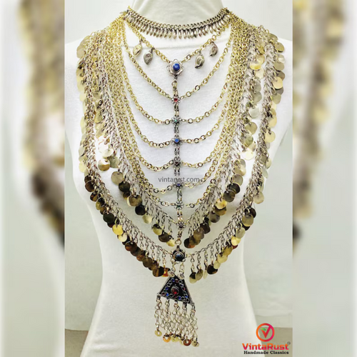 Vintage Afghan Tribal Multilayer Necklace with Glass Stones