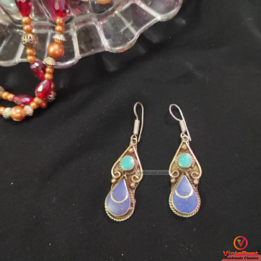 These Afghani Boho tribal earrings are made up of semi-precious turquoise and lapis lazuli stones. This charming tribal piece is light in weight and is easy to wear. This rustic hued tribal piece will give vintage vibes whenever you will style them.