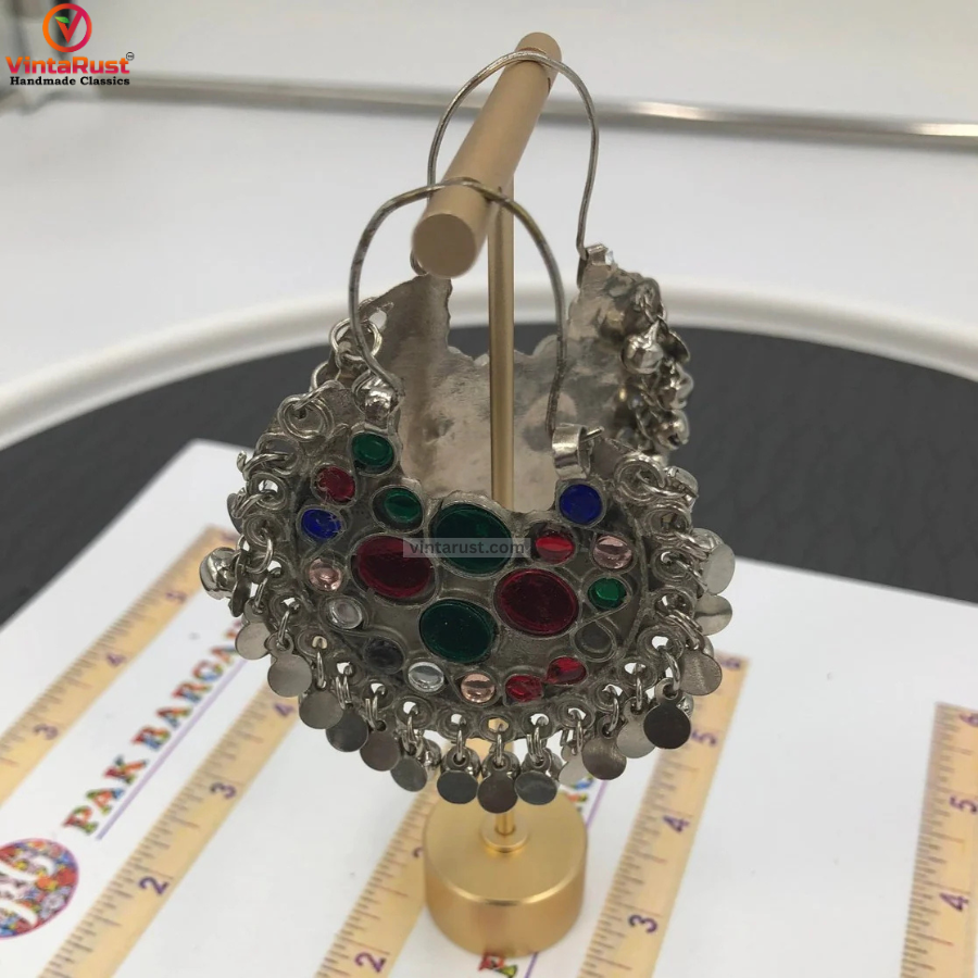 • Multihued glass stones are used in this stunning tribal piece. In this moon shape tribal hoops, glass stones are embellished to symbolize depth and modesty which you feel after wearing this gorgeous tribal jewelry. Ensured with a lever back closure this piece is intricately crafted to perfection by hardworking souls.The earrings are crafted using traditional techniques and materials, such as oxidized silver, which gives them a vintage and rustic look. The small bells attached to the earrings create a gentle jingling sound with each movement, adding to their charm and uniqueness.