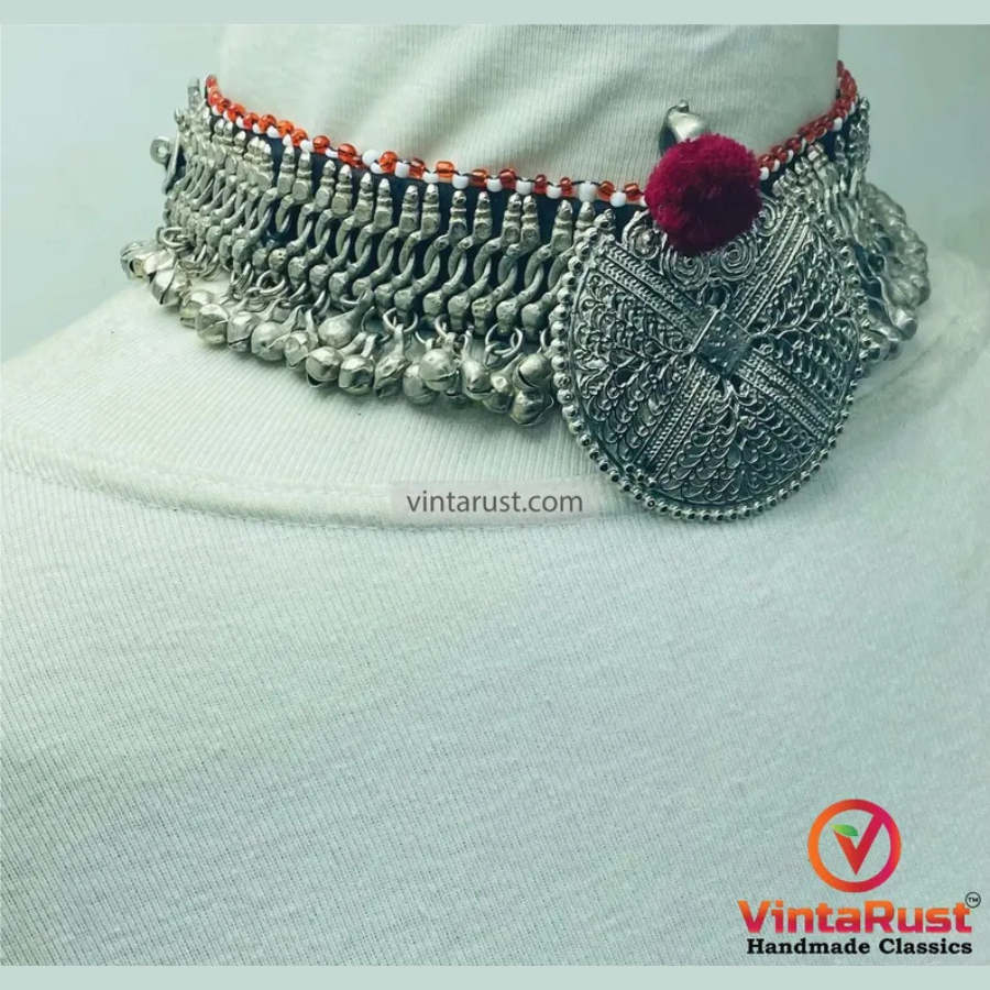 The choker has a round central detail. A thin red thread runs along the top edge. The design is sturdy and well made. It is lightweight and easy to wear.