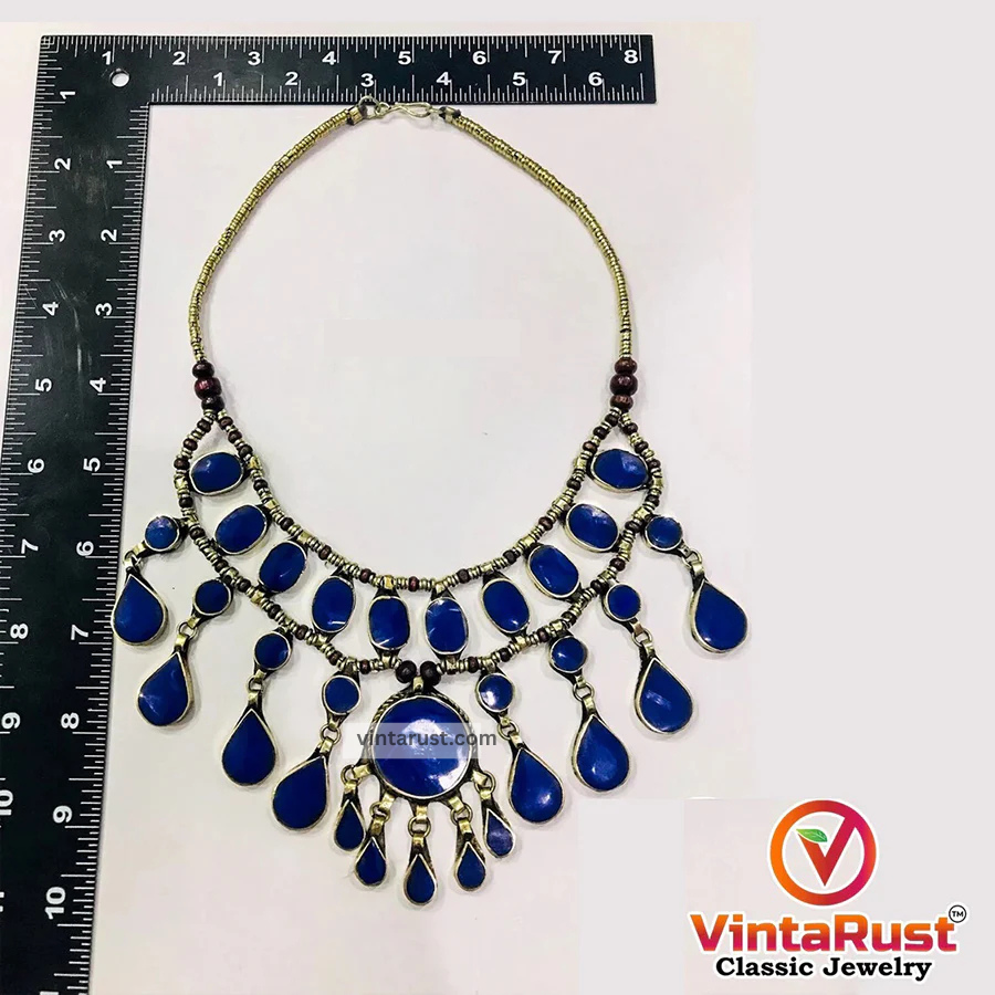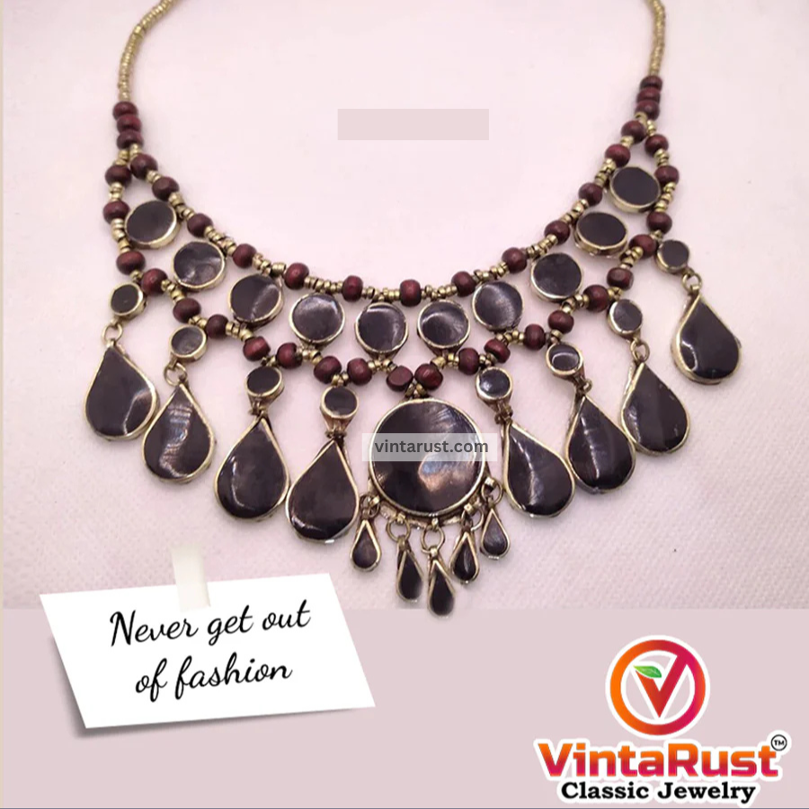 This vintage-inspired neckpiece is created with the finely chosen lustrous stones which are finely enclosed with the metal body are wholly mesmerizing. It featured two layers which truly signifies that how South Asian’s complement beauty, the first layer is compactivity enclosed with medium-sized stones conveys a portrayal of pearls are encircled in a thread, the lowest layer is featured with an array of tiny stones which are loosely associated with medium stones which convey splendid dangling tone. The mega stone at the core is the sole pendant itself which also comprises sub tiny stones. The phrases can’t describe its magnificence that how intelligently the beads are encircled in a golden thread which is also wrapped with brown rusty shade very tine beads which delivers contrast profile. If you Search Tribal necklace, Stone necklace, Bib necklace, Handmade jewelry or Rustic necklace then its best for you.