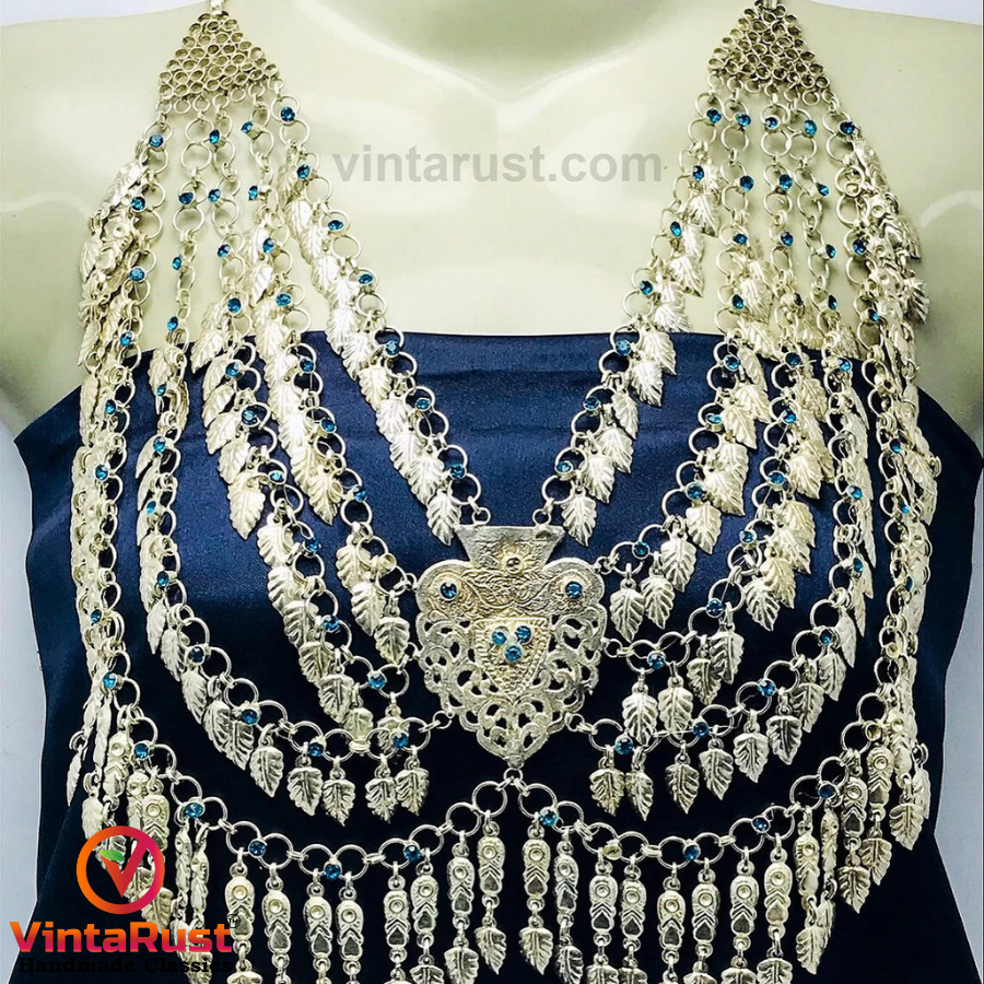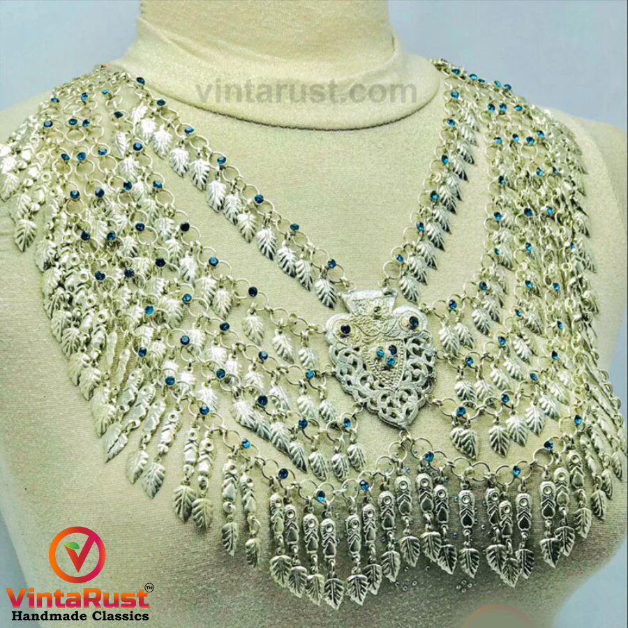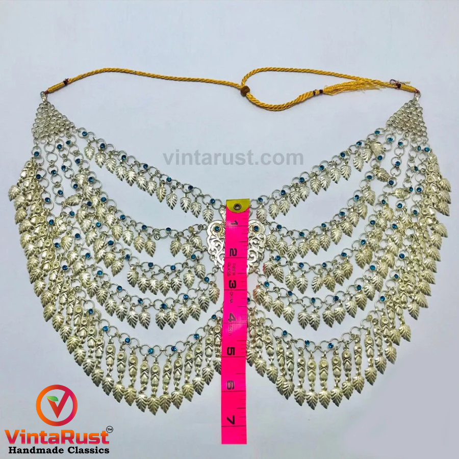 The fine details and antiquity of this precious tribal necklace are making it an alluring vintage piece of art. It features leaf motifs dangling at the bottom of each layer with glass stones embedded within the chain. The chunky pendant strung in the middle is the centerpiece, crafted with metal alloy and covered with striking silver hues.