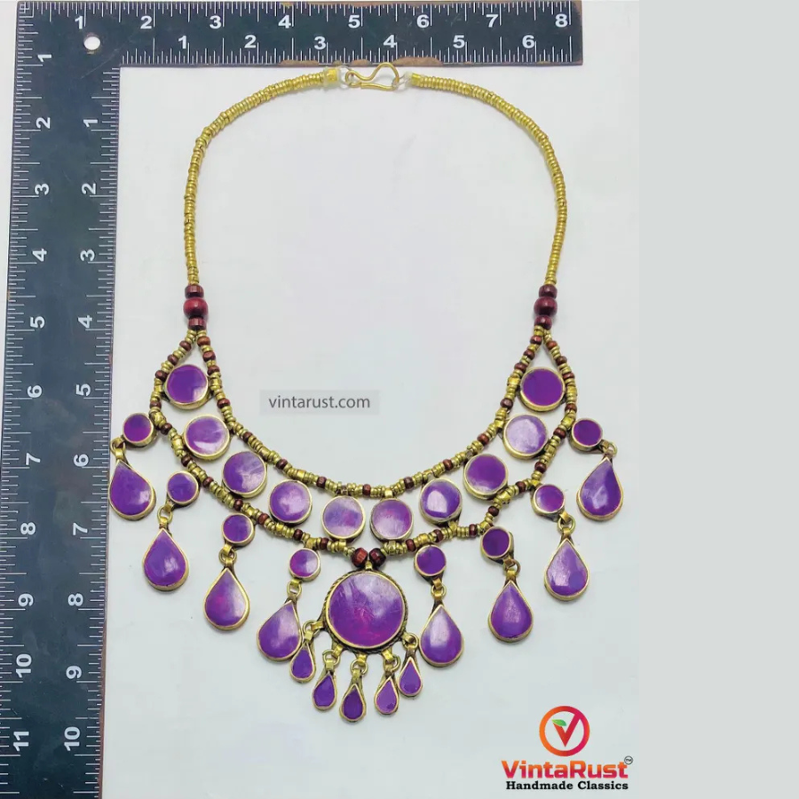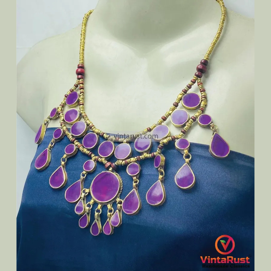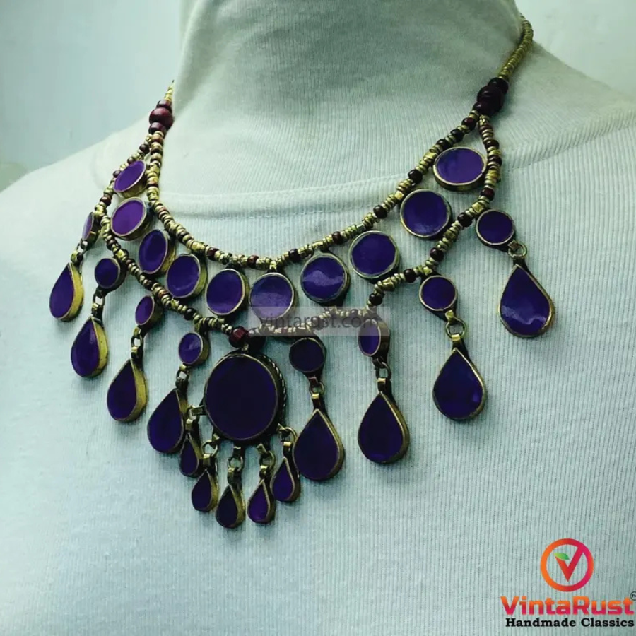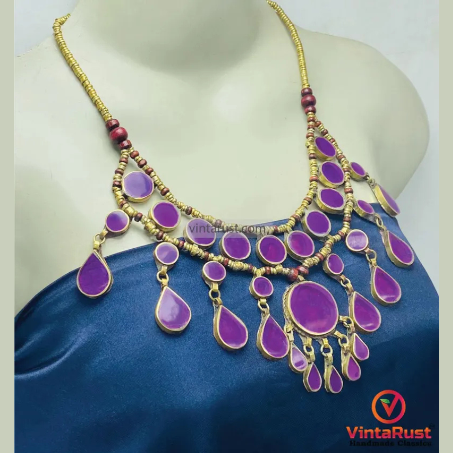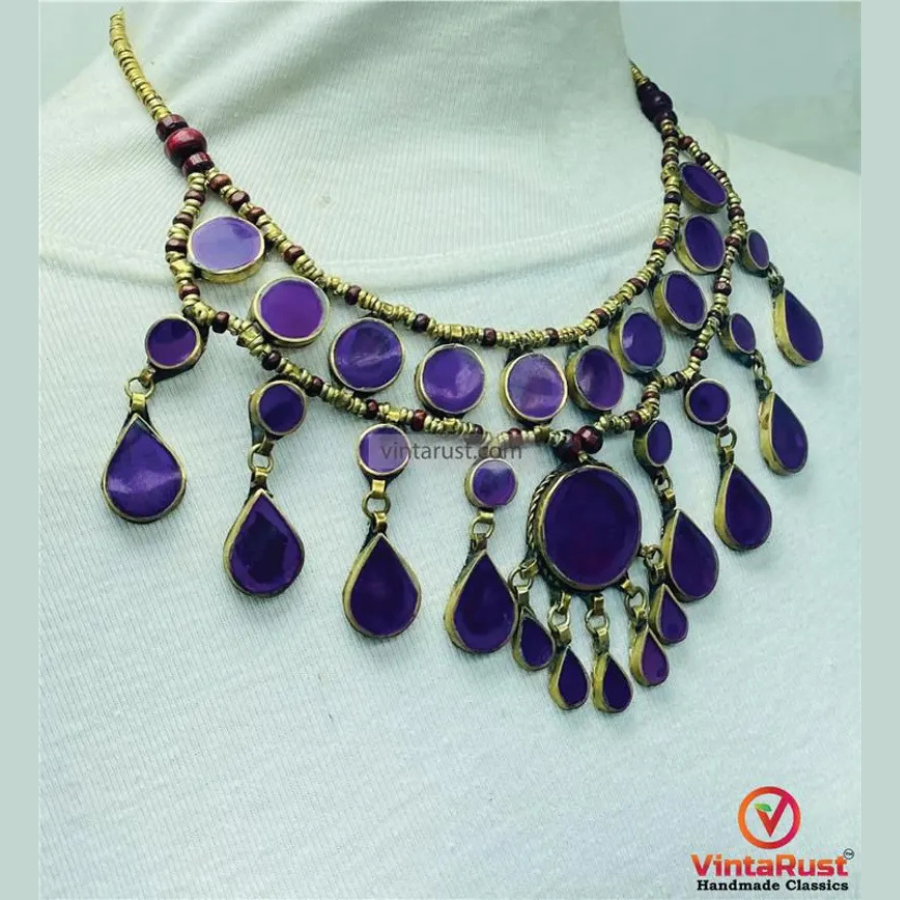 Discover the elegance of this exclusive Afghan traditional necklace, featuring semi-precious amethyst stone embedded within copper wooden beads. This stunning piece showcases a three-layer design, with each layer presenting a unique shape that highlights the creativity and artistry behind its creation. This handmade elegant necklace is not just a classical ornament but a timeless piece always in trend.
