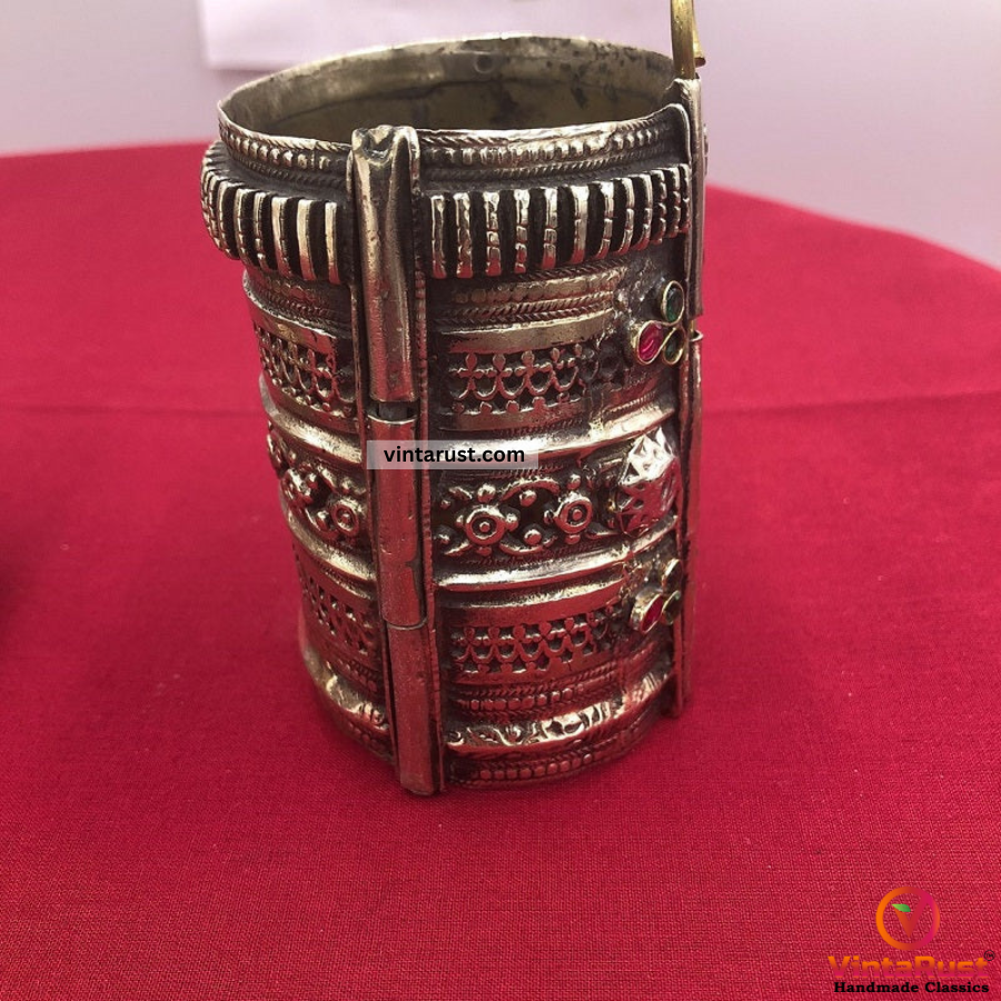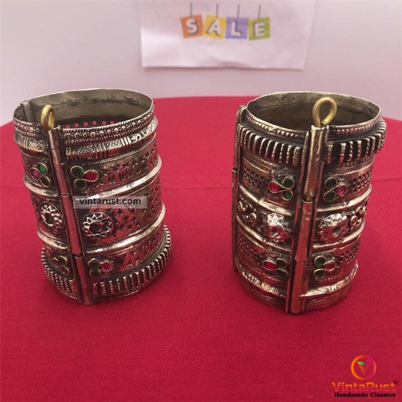 These rustic-hued Afghani handcuffs is a bold and stunning statement cuffs made up of finest quality of metal alloy and inlaid with beautiful delicate pink and green glass stones. The glass stones beautified in this handcuff are newly added and they are bright and eye catching. These Afghani handcuffs has been polished to give a fine look. These tribal cuff gives historical vibes whenever you style them.