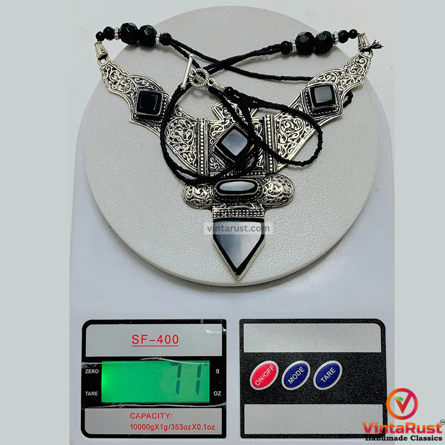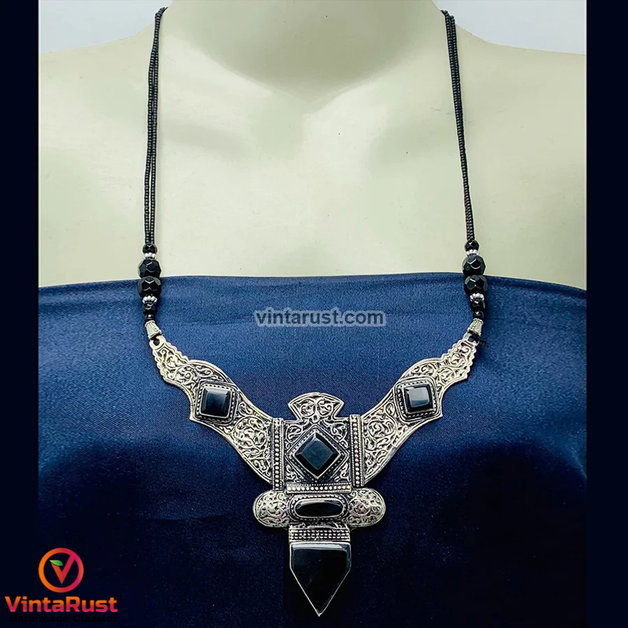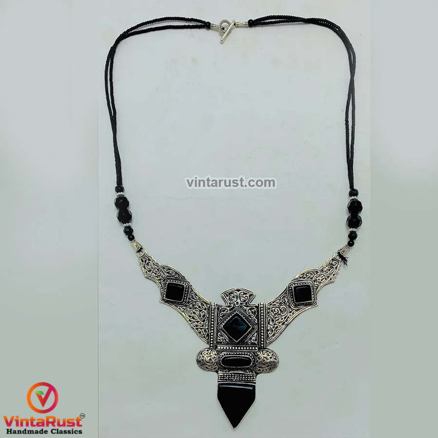 Discover the allure of this Antique black Nepalese Triangular Pendant necklace, a captivating piece of handcrafted jewelry that adds a touch of history and elegance to your ensemble. This pendant is a true testament to the rich traditions and craftsmanship of Nepal.