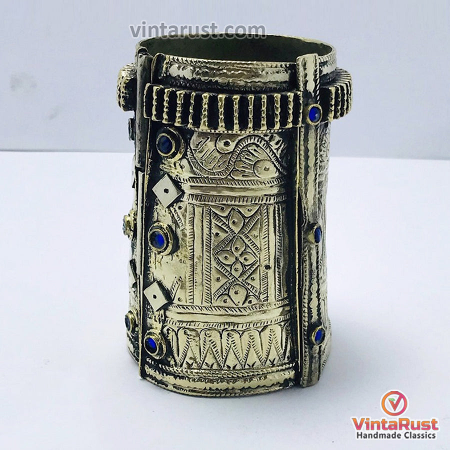 This vintage inspired tribal ornament is handcrafted by natives of Central Asia. The nicest quality of the material is chosen while making this extremely majestic tribal item. The unique design of floral embossed on this piece of art enhance the antiquity of this piece. Dreamy blue glass stones are inlaid in this tribal piece, which are enhancing the antiquity of this handcuff.