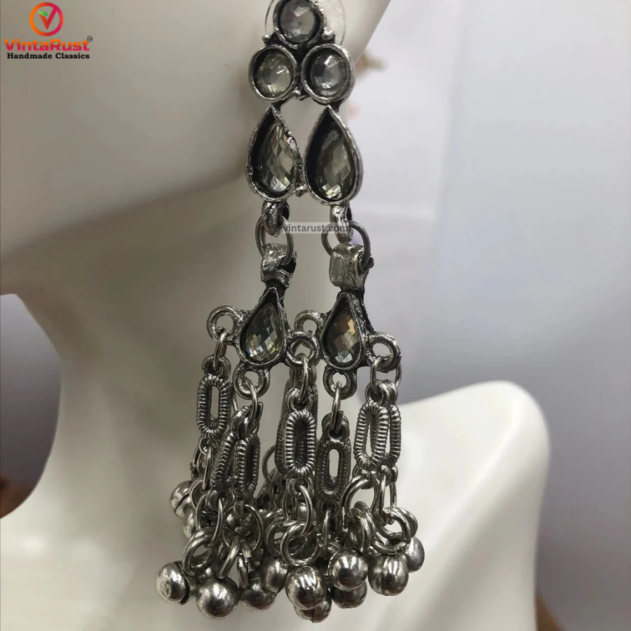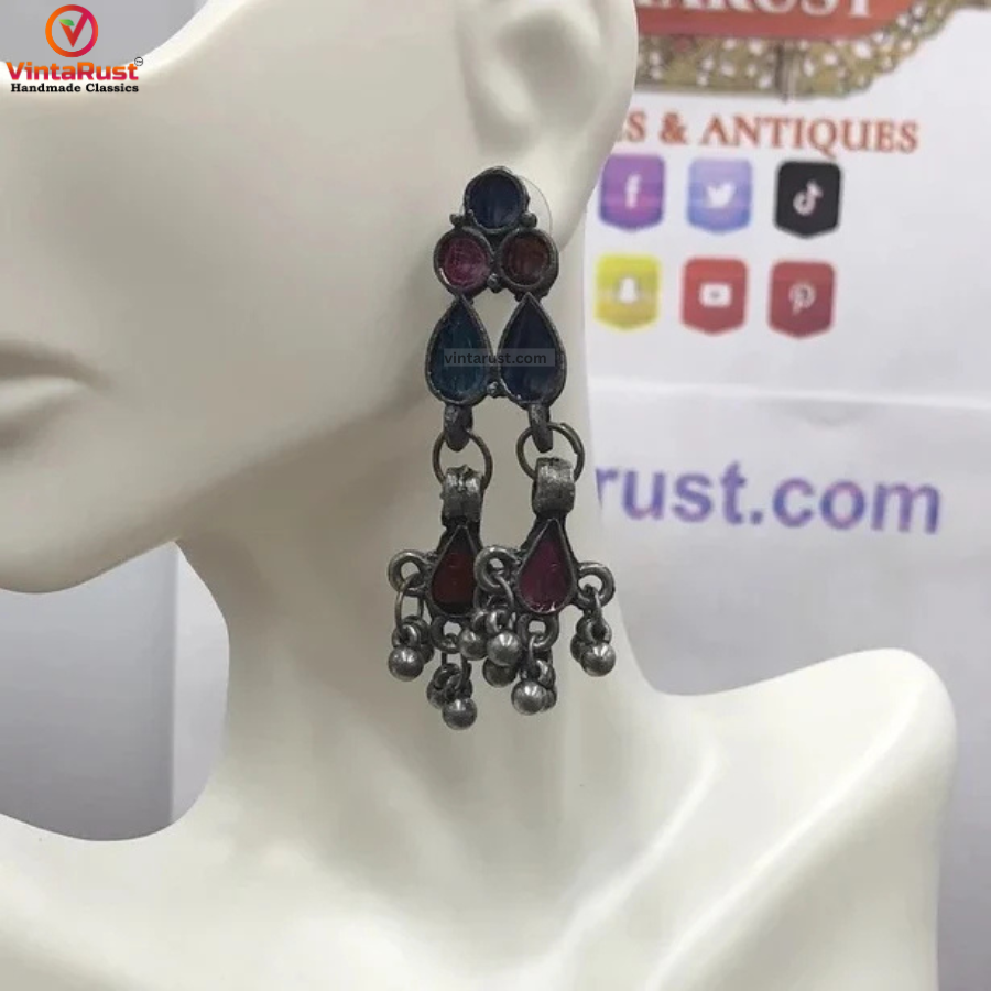 • This vintage-inspired tribal piece is one of the most admired pair of antique tribal earrings from our collection. This antique jewelry piece is available in two styles. Beautified with glass stones of different colors this ethnic tribal jewelry has rhythmic bell to create tribal environment with every movement.