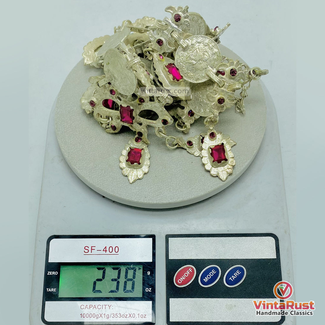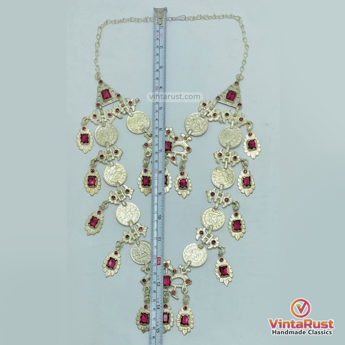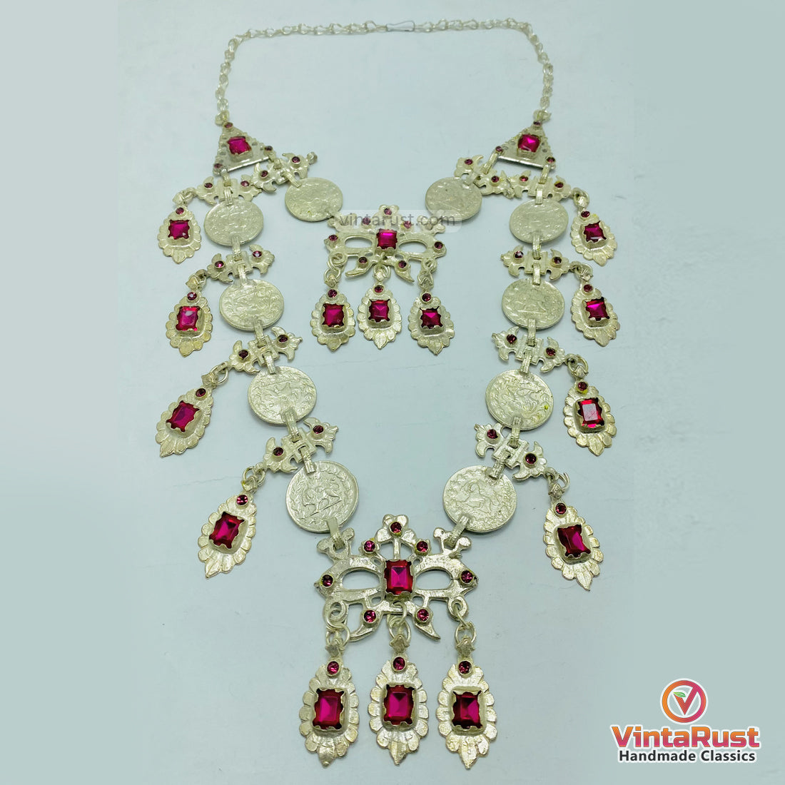 The necklace has round metal coins linked together. It has an antique silver finish on the surface. Small red stone details are added in the design. These stones give a nice contrast to the silver color.