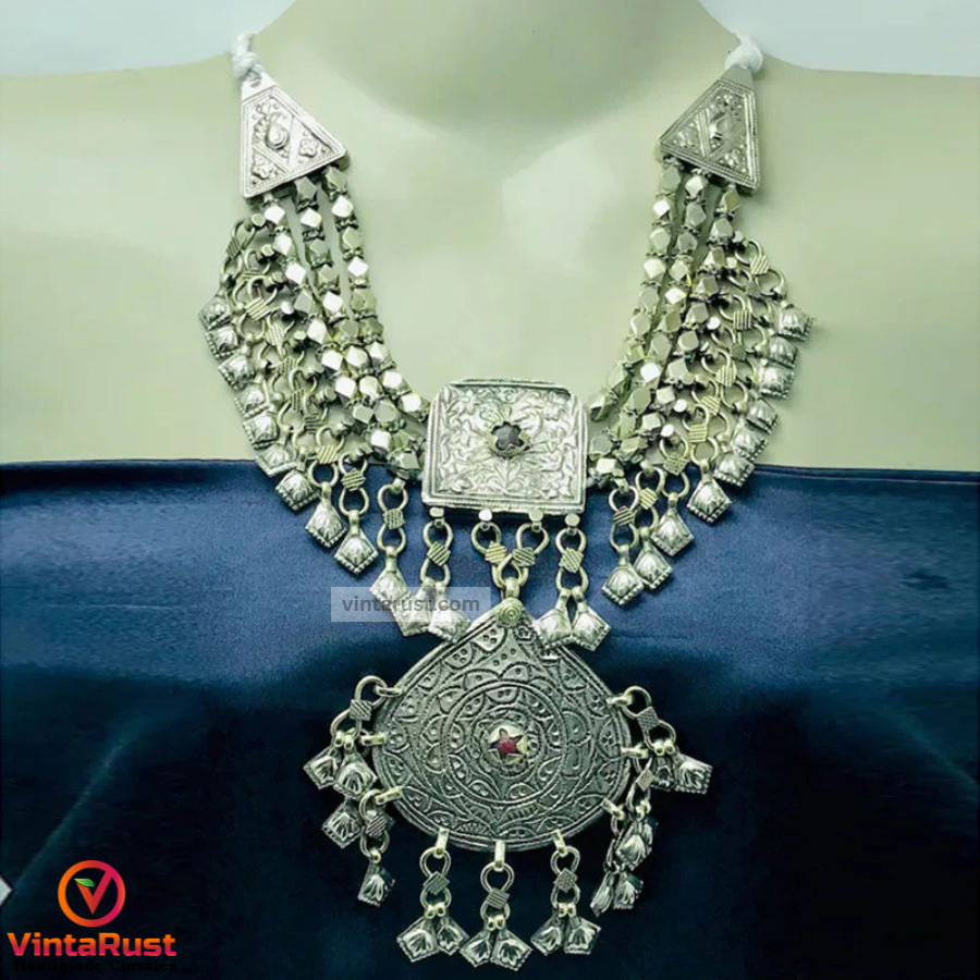 This charming vintage tribal necklace was handcrafted in the late 1990’s by the exceptional craftsmen of Central Asia. This gypsy necklace is a unique piece from our collection. This traditional Afghan necklace looks as if it belongs in a museum. It delivers historical vibes when you wear it. An elegant large pendant with a hand-engraved design is crafted on this ethnic silver necklace.