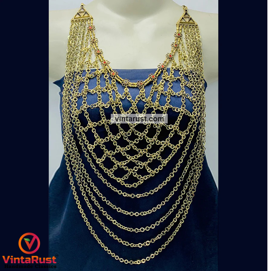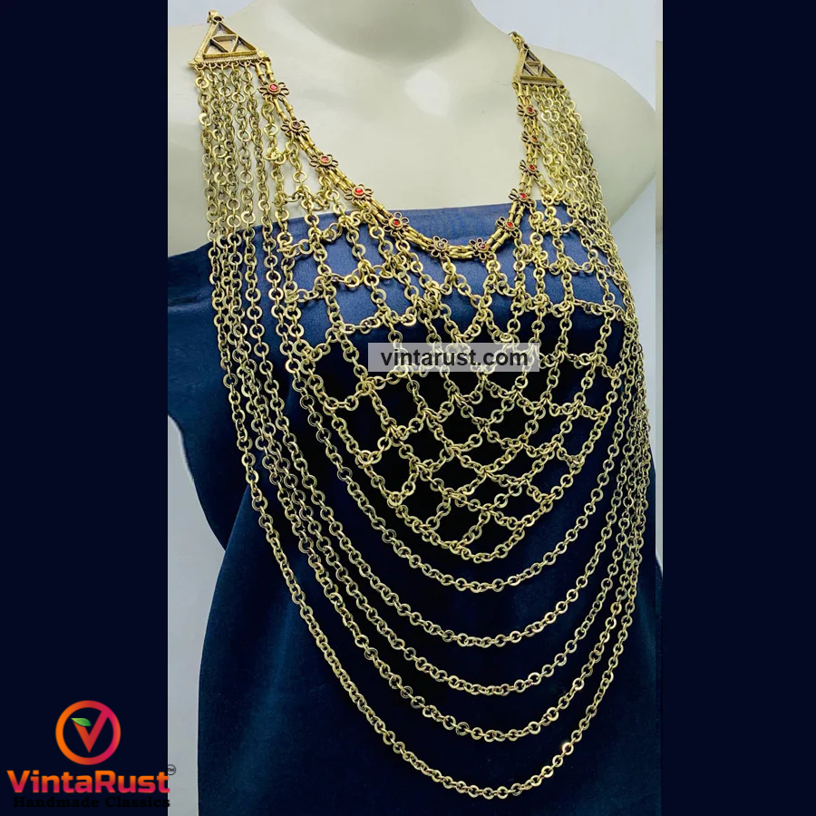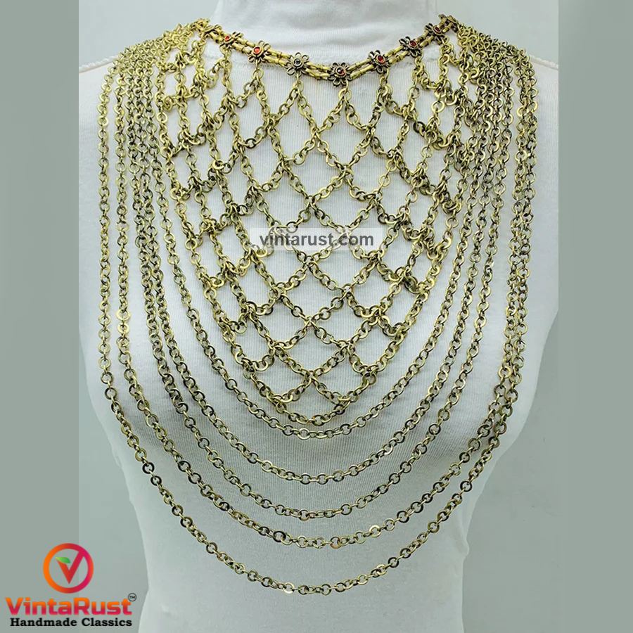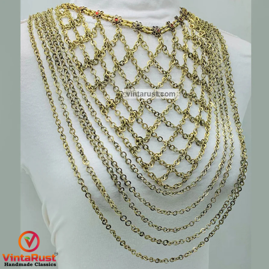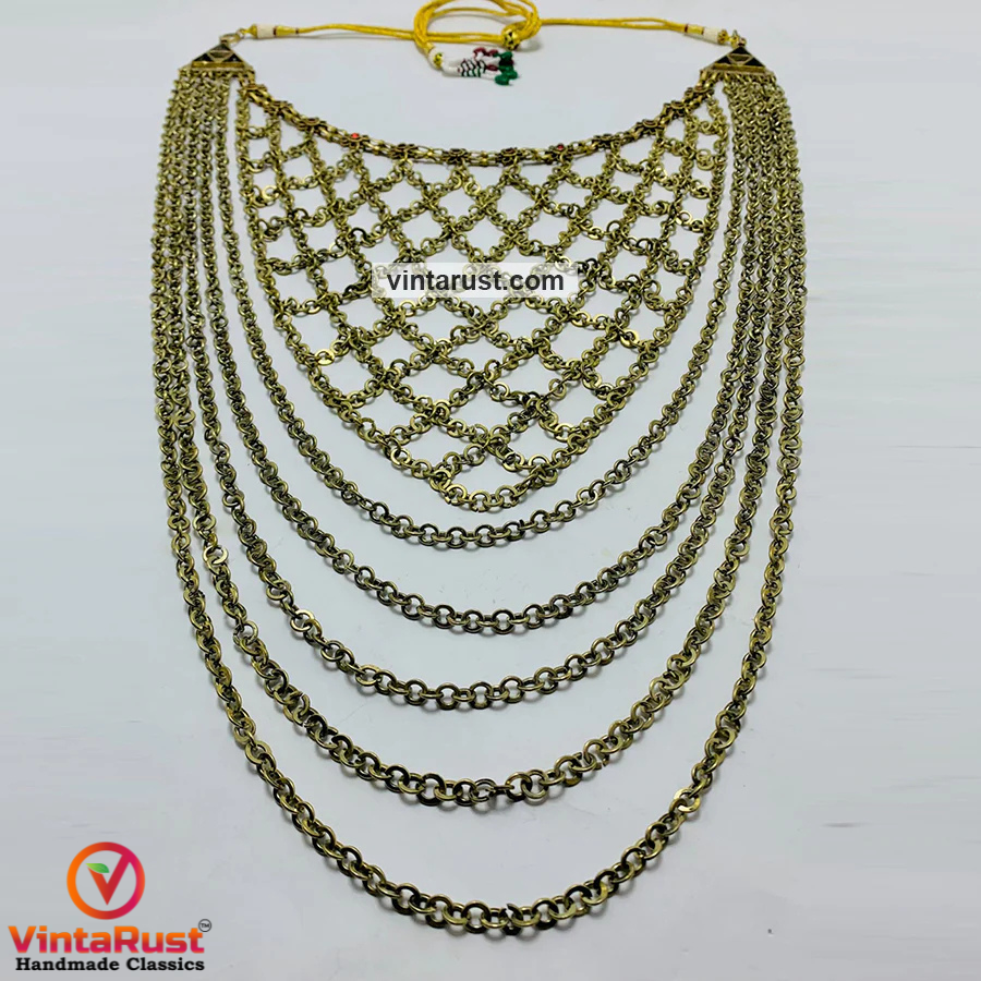 This tribal necklace is made up of the best quality metal alloy. This tribal massive necklace gives you an elegant and traditional look with a tribal feel. Metallic wires are assembled uniquely and form multilayers which gives you a complete royal look. This vintage-inspired multilayer tribal necklace is an ethnic piece of tribal and traditional jewelry from our collection.