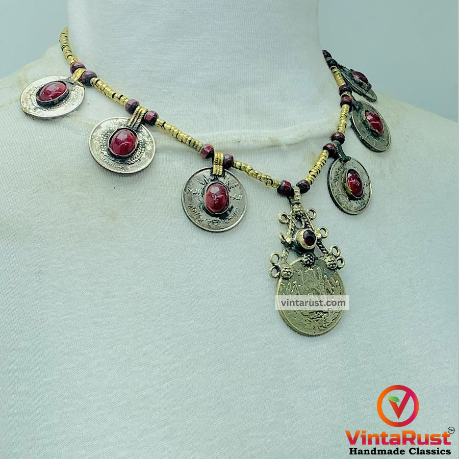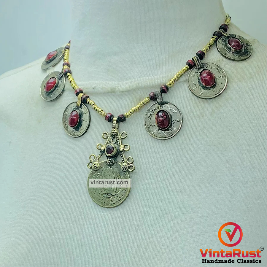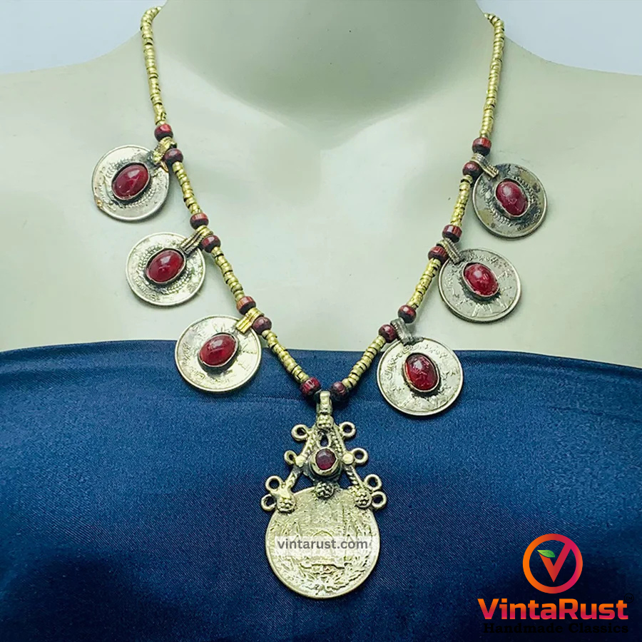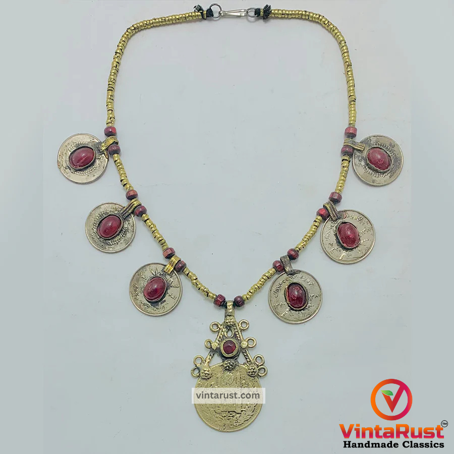 Crafted with care, this necklace features red hued stones and intricate details that reflect the rich history and traditions of the Turkmen pepeople. Unlock the allure of Turkmen heritage with the Vintage Round Massive Pendant. Experience the beauty of cultural significance and elevate your style with this exceptional piece of jewelry.
