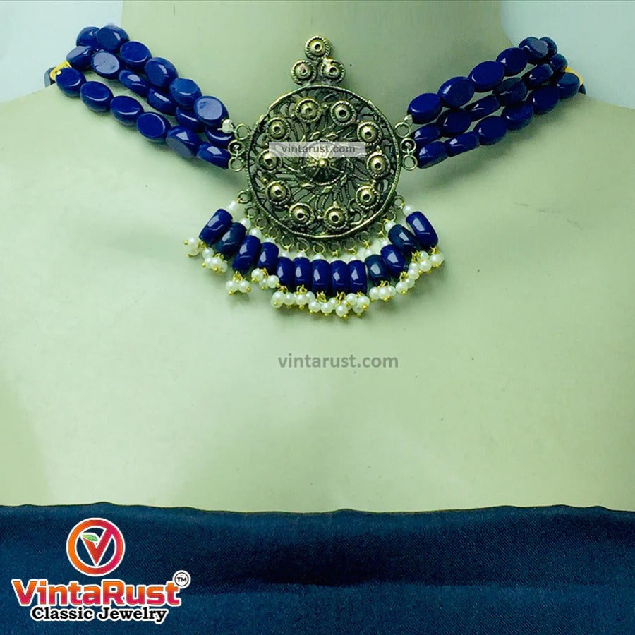 This graceful vintage tribal jewelry set has captivating visuals. The benefit of owning this tribal jewelry set is that it can be paired with traditional dresses as well as with modern dresses. Pairing this necklace with a plain white or black dress will give you an ethereal look.This elegant tribal jewelry is available with beads of three different colors. You can select the one you like the most from black and blue.