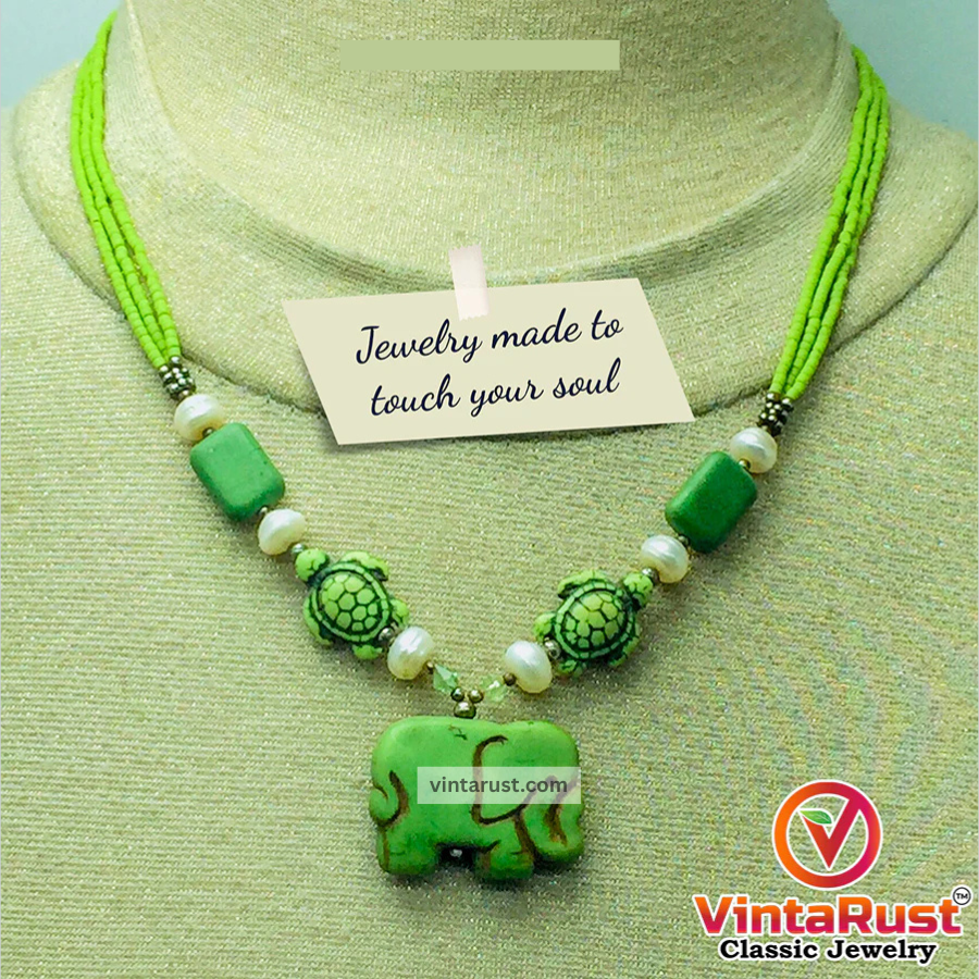 This beaded necklace is made up of semi-precious green or red beads. This unique piece of ornament is designed by Central Asian craftsmen. Elephant-shaped locket is attached to this necklace. Tortoise beads are giving natural vibes to this necklace. Multicolor beads are used in necklace for spacing. Every piece of this necklace gives this necklace a natural and raw look.