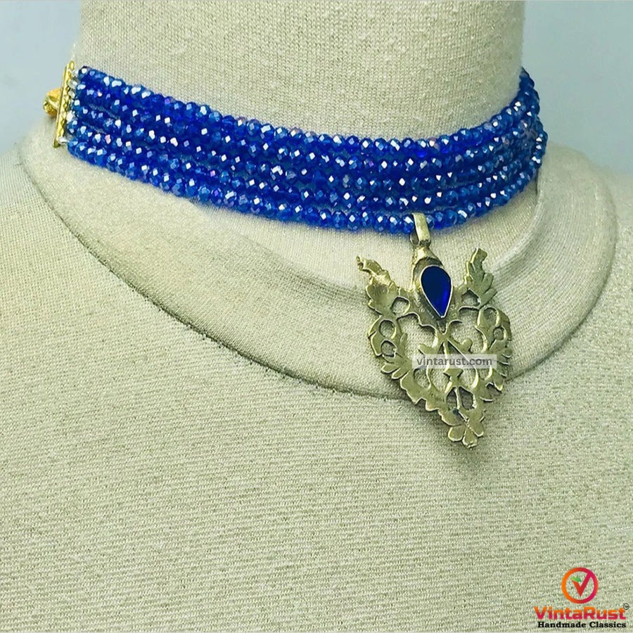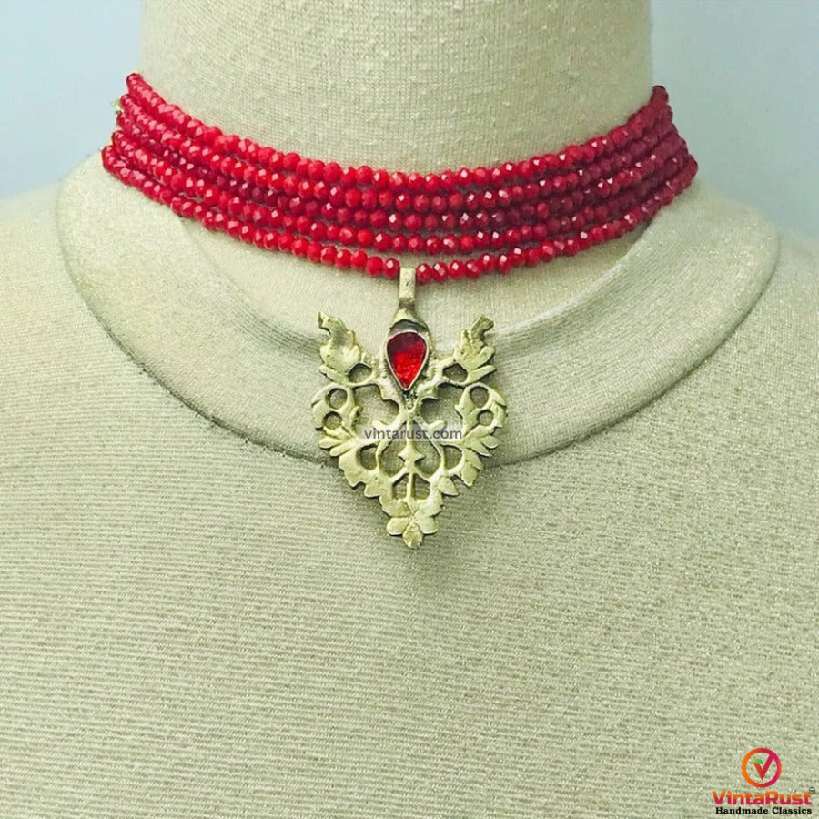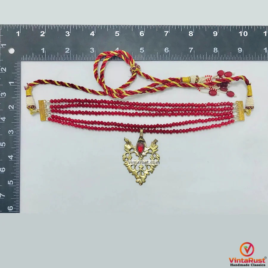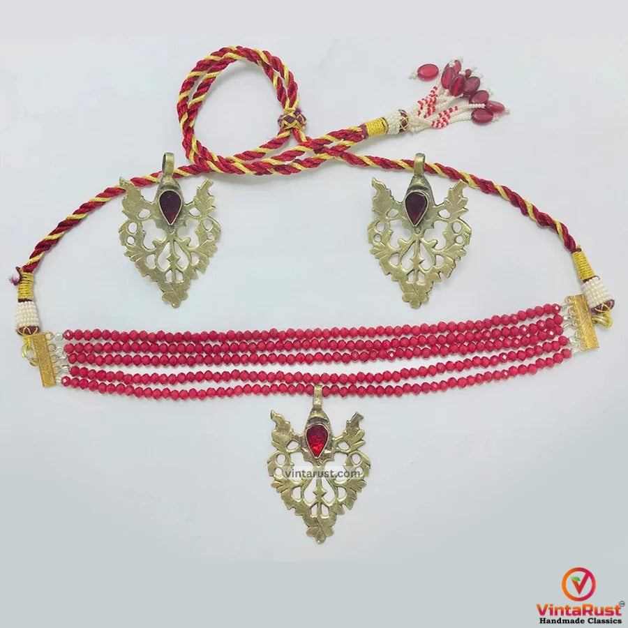The multilayer tribal choker necklace has tiny red beads beaded elegantly. An antique floral leave pendant is inlaid in the center of the choker. The rustic hues of this metallic choker are giving vintage vibes. This extremely charming jewelry set is one of the praiseworthy pieces.