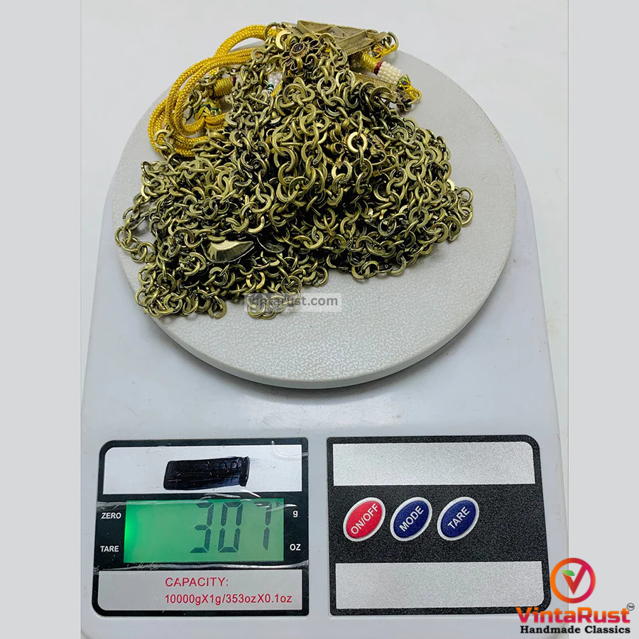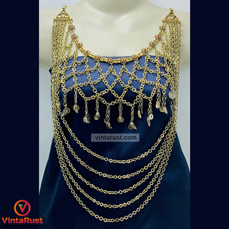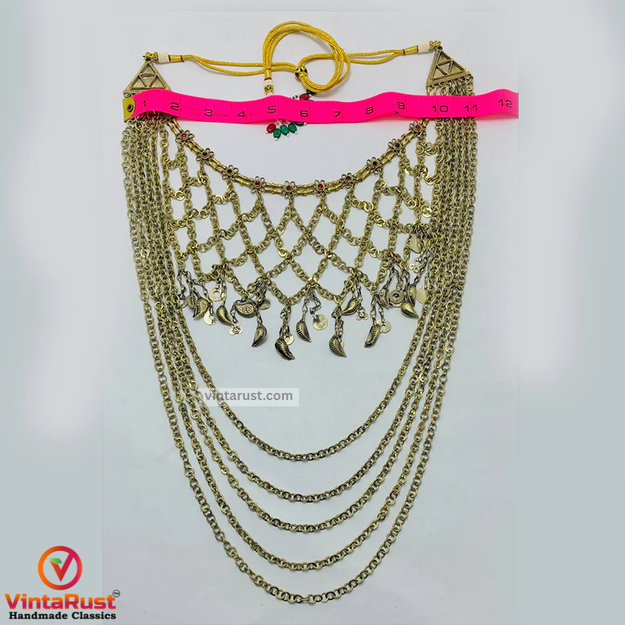 This statement massive tribal necklace was handcrafted in the early 1990s. This multilayer tribal necklace has silver dangling pendant with multihued glass stones engraved in it. The chains used in this necklace are depicting a vintage feel. These metallic chains with metal leaves are enhancing the look of this necklace. In the above portion of the necklace, multi-hued glass stones are used to give a tribal feel to this necklace.