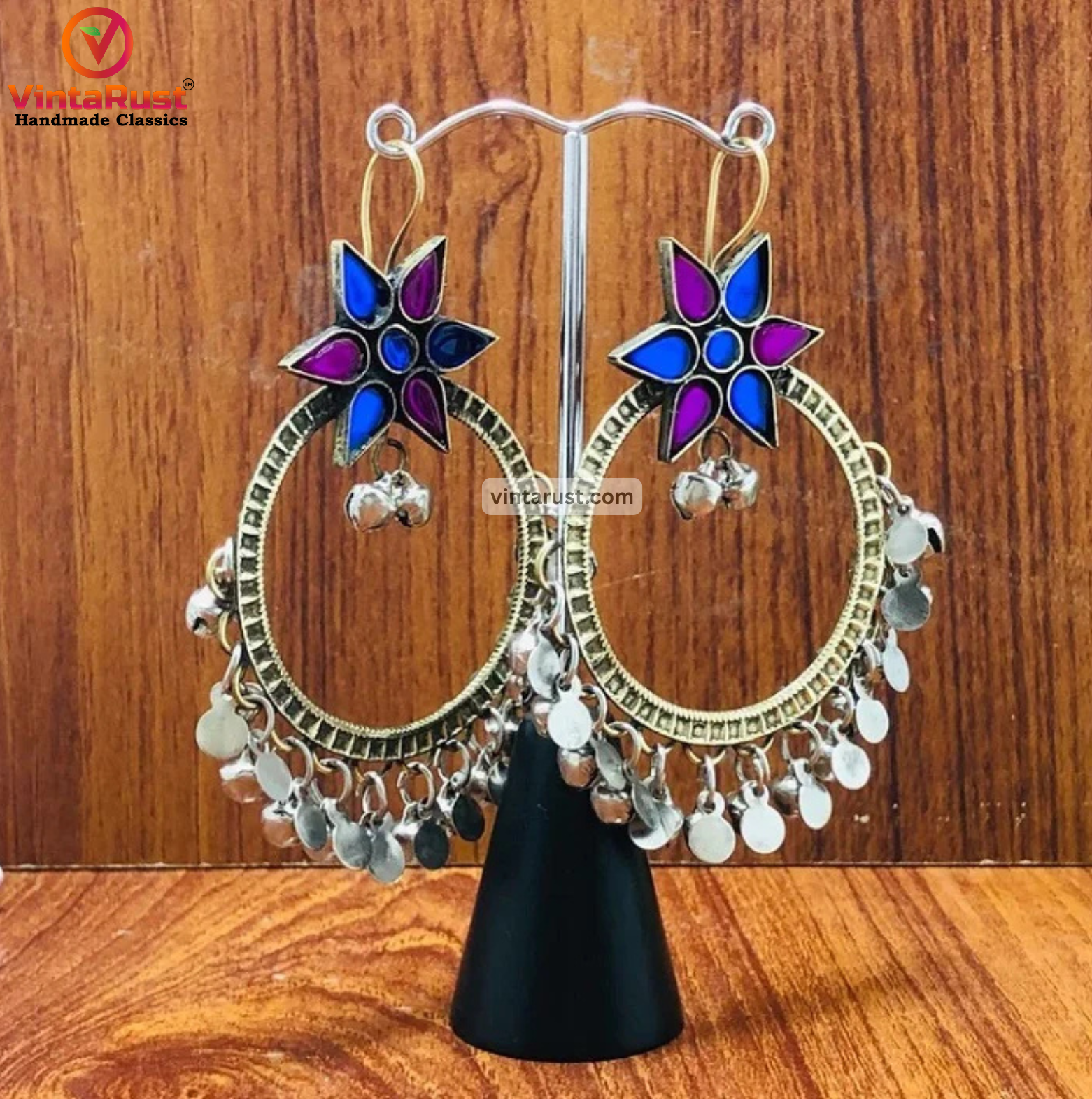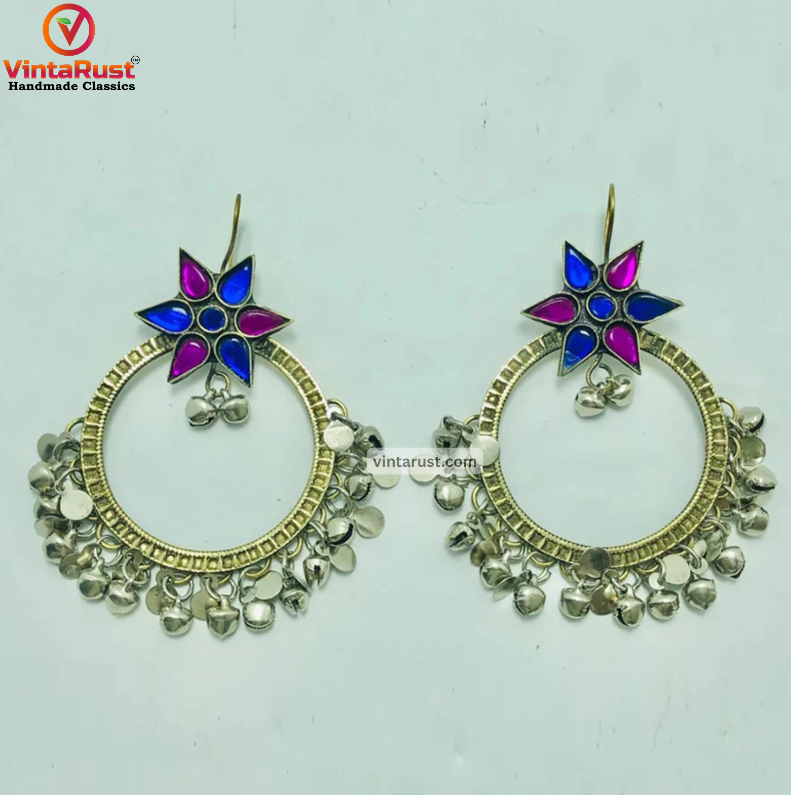 These beautiful and detailed traditional design earrings have an eye-catching yet minimalistic shape and design. The upper center is inlaid with purple and blue glass stones in a flower shape. These traditionally rich tribal earrings are handmade in South Asia and make the perfect earrings for the summer season. These earrings are handmade with the finest quality of metal alloy.