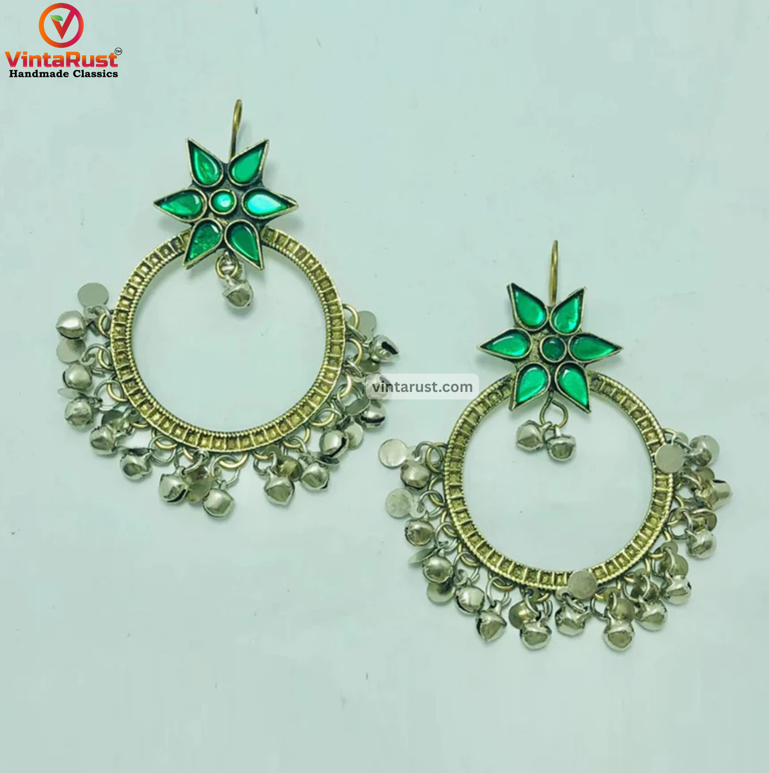 These handmade earrings are made with perfection and they are very lightweight. This vintage-inspired pair of tribal earrings have dangling metallic leaves at the bottom which is used for enhancing the beauty of these antique tribal earrings. Ensured with a hook closure of fine quality this piece is intricately crafted to perfection by hardworking soulCrafted from high-quality materials, these earrings feature a large, round hoop design that is both eye-catching and versatile. The addition of tiny bells to the hoops adds a playful element to the design, creating a unique and fun accessory that can be worn with a variety of outfits.s.