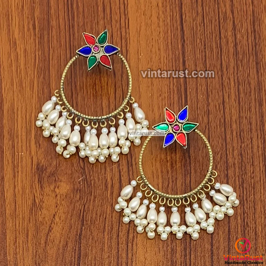Elevate your elegance with these stunning big hoop earrings with pearls and glass stones, inspired by traditional designs. Crafted with intricate detailing, these tribal earrings boast an eye-catching yet minimalist shape and design. At the upper center, vibrant purple and blue glass stones form a captivating flower motif, adding a touch of elegance to these tribal-inspired earrings.
