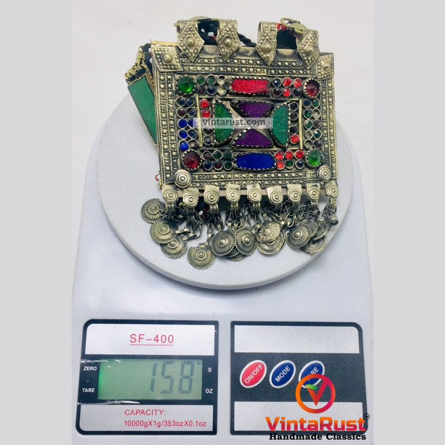 This Stunning statement necklace made with antique bohemian style, has two long beautiful strips that have Glass mirrors of blue and green color inlaid on this tribal mala necklace. The intricate design is carved on both sides of the necklace which makes this necklace look like an antique item that is historically rich. It also has a large vintage kuchi pendant in the center beautified with dangling tassels.