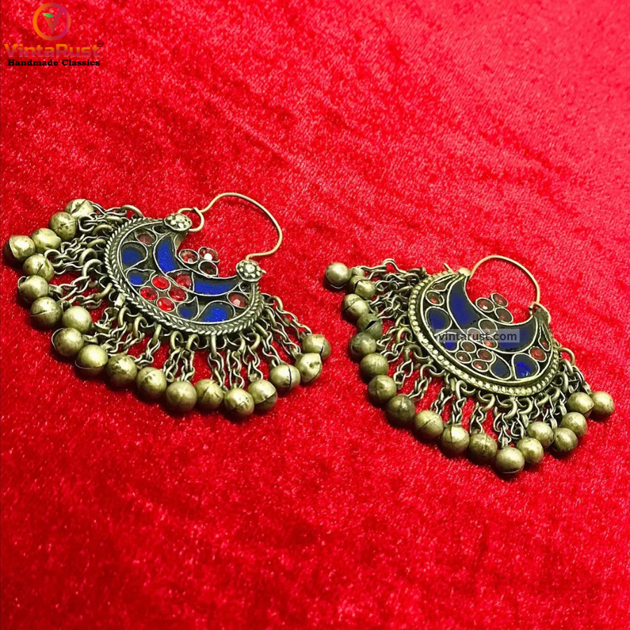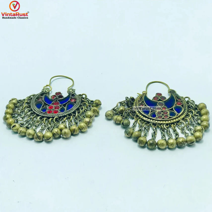 • These rustic golden tribal earrings are one of the tantalizing pieces we have in our collection. The use of candy red and delicate blue glass stones is done in making this tribal piece look more attractive. The rhythmic bells create a magnificent environment and with every step you feel the part of history.