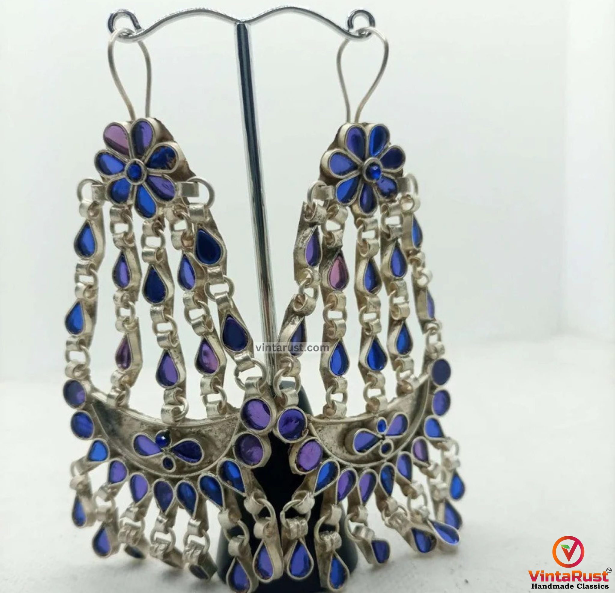 These chandelier-style earrings are handmade by the local Himalayan artisans living in the small and scenic valleys of South Asia. The blue stones are astonishingly placed within the strands connected to the floral top and bottom. These earrings are light in weight and quite easy to be carried all day long despite the fact that these earrings are quite sizable in style.The earrings feature a bold and beautiful design, with intricate detailing and vibrant blue glass stones set in a silver-tone metal. The size of these earrings is quite large, making them a bold and eye-catching accessory that is perfect for special occasions or for adding a touch of drama to your everyday look.