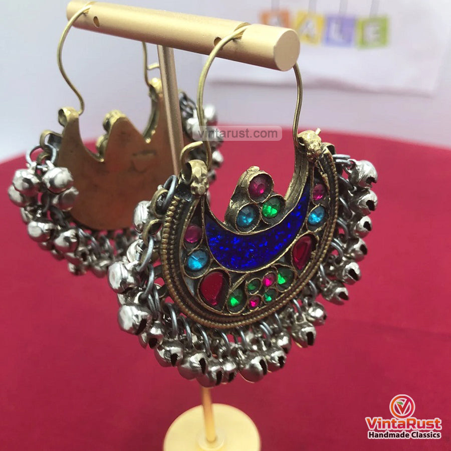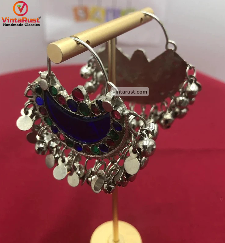 Gorgeous silver clamshell bells hang from the bottoms of the earrings and create mesmerizing sound with every movement. The earrings are made of fine-quality of German silver. In the moon shape, blue glass stones are embellished in this piece to symbolize depth and modesty which you feel after wearing this gorgeous tribal jewelry.