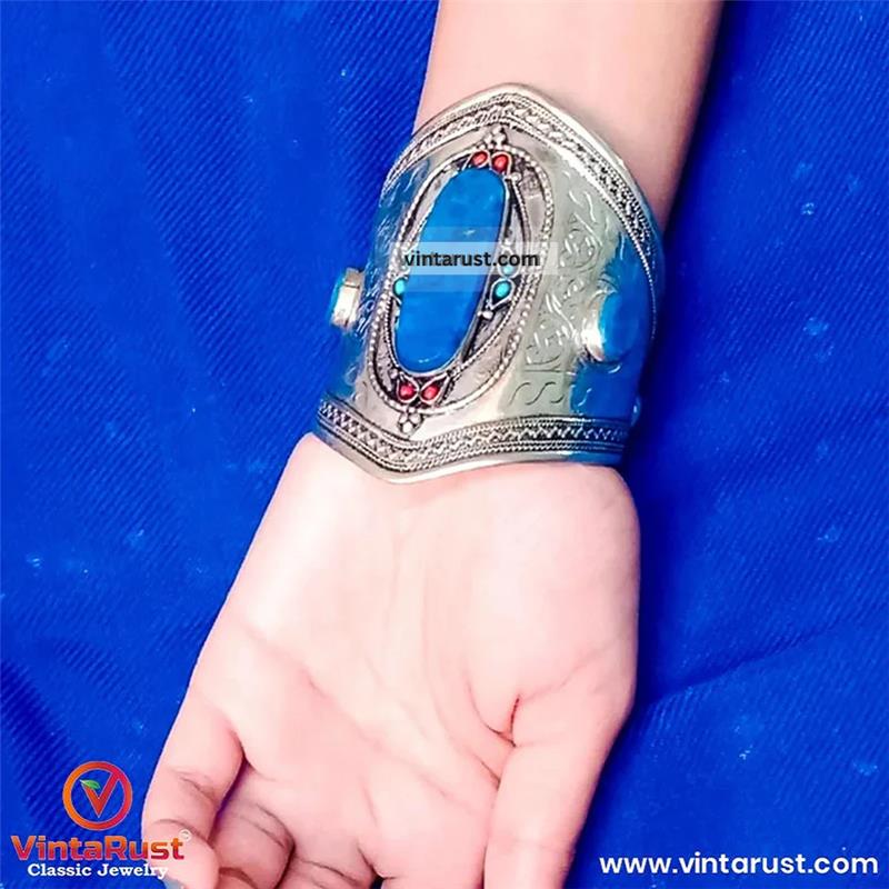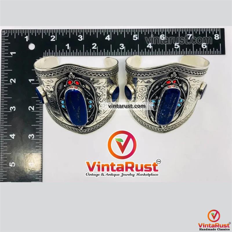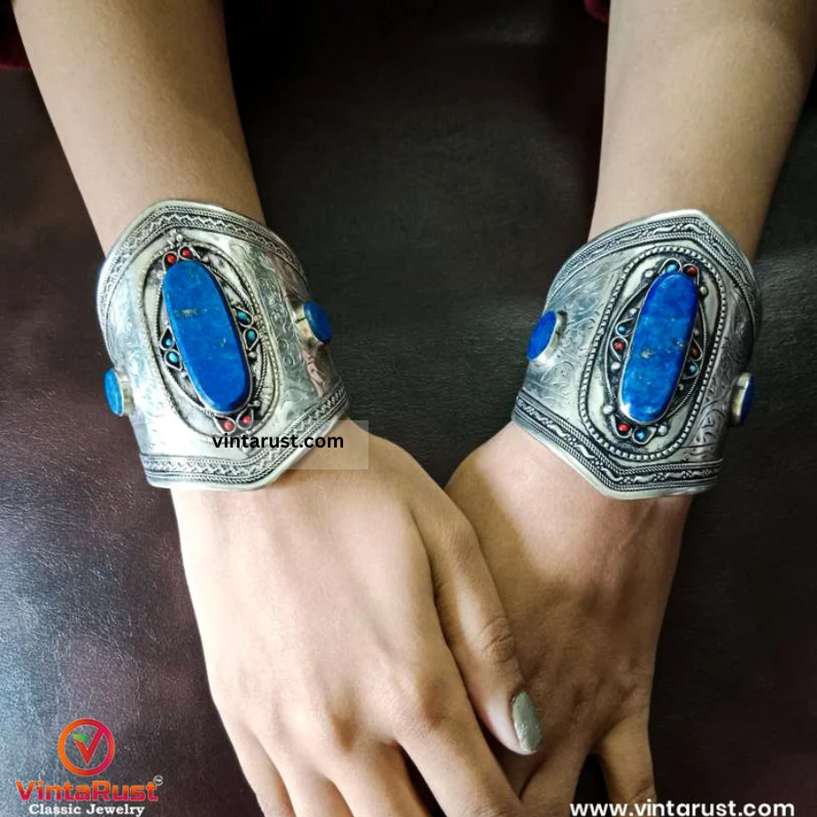 This handmade bracelet is a timeless vintage craft, perfect for lovers of artisanal jewelry. It features mixed metal and stonework, as well as carved intricate patterns inspired by tribal culture. The adjustable bracelet is designed to fit any wrist and is embellished with Lapis Lazuli stones.