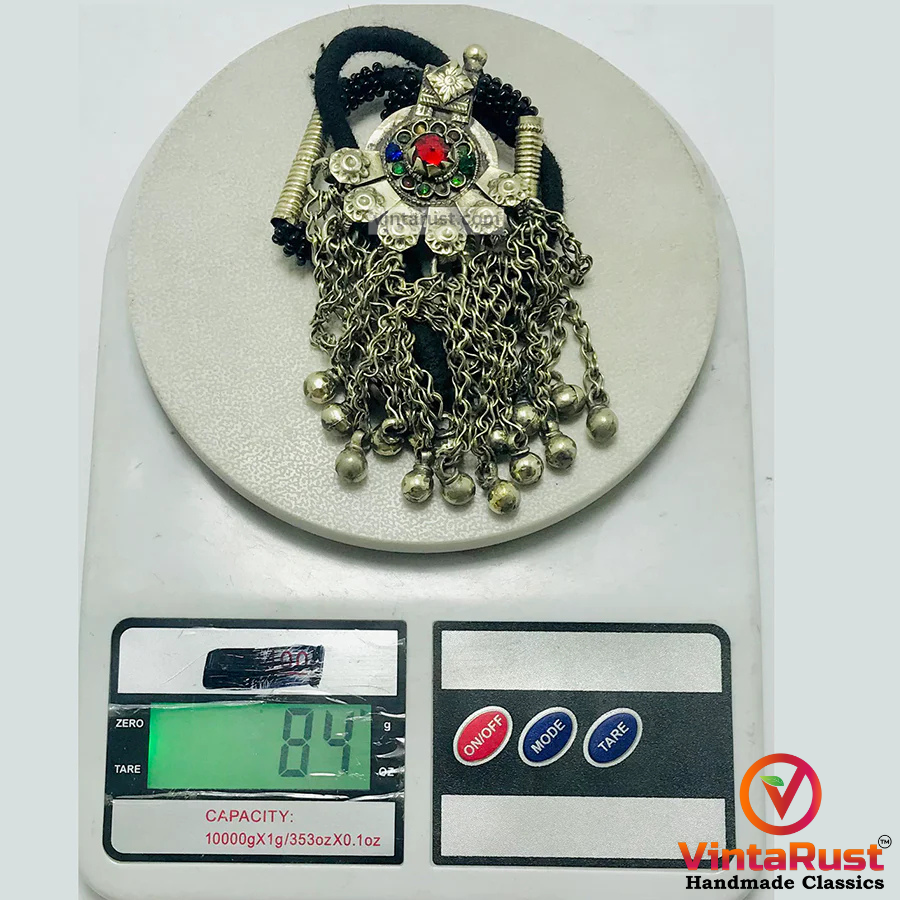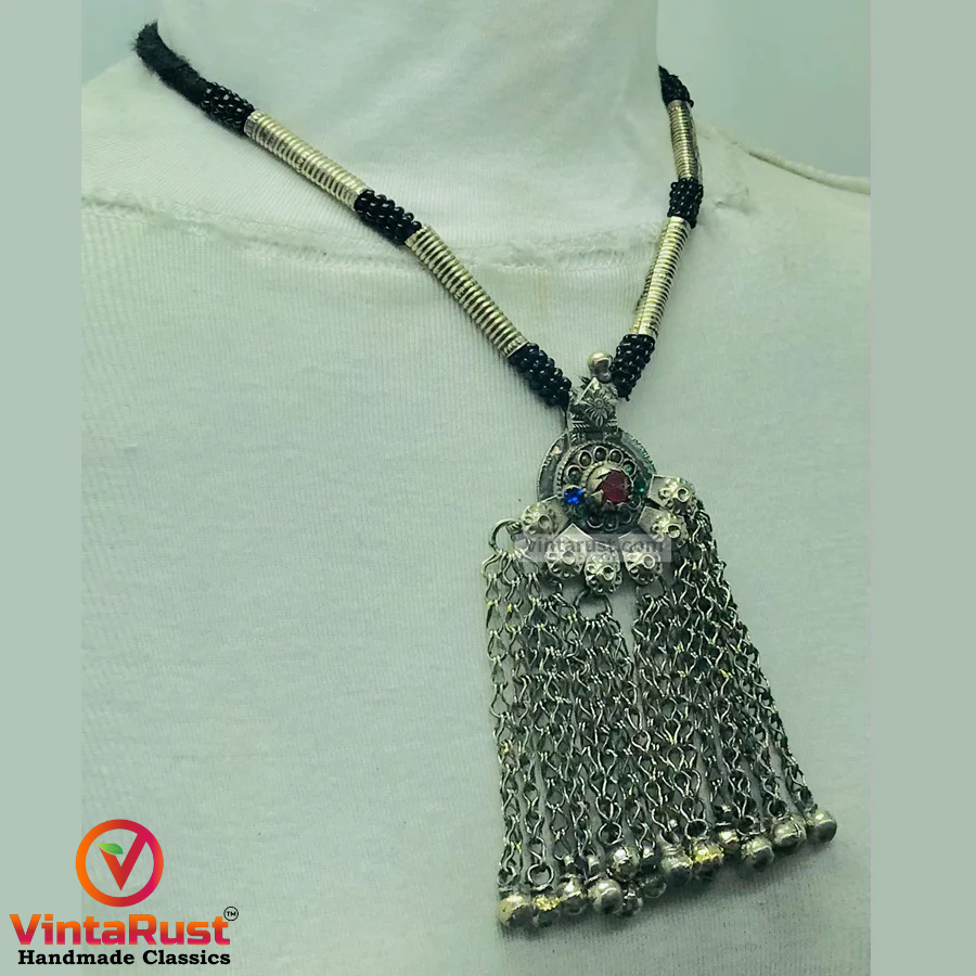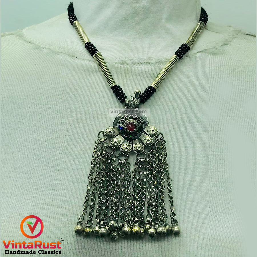 The historical feel this Kuchi pendant necklace gives is incredible. This exquisitely crafted necklace is crafted to perfection. Meticulously crafted dangling tassels are beautified in this necklace. The magnificent pendant in this tribal ethnic necklace is embellished with silver dangling rhythmic bells with chains.