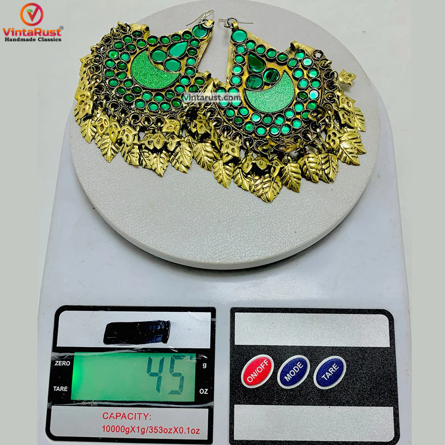 These charming Afghani pairs of earrings are epitome of tradition, embellished with green glass stones and dangling bells at the bottom. The green glass stones embedded in these earrings complimented by the silver tones of the earrings are flaunting all the tribal vibes.