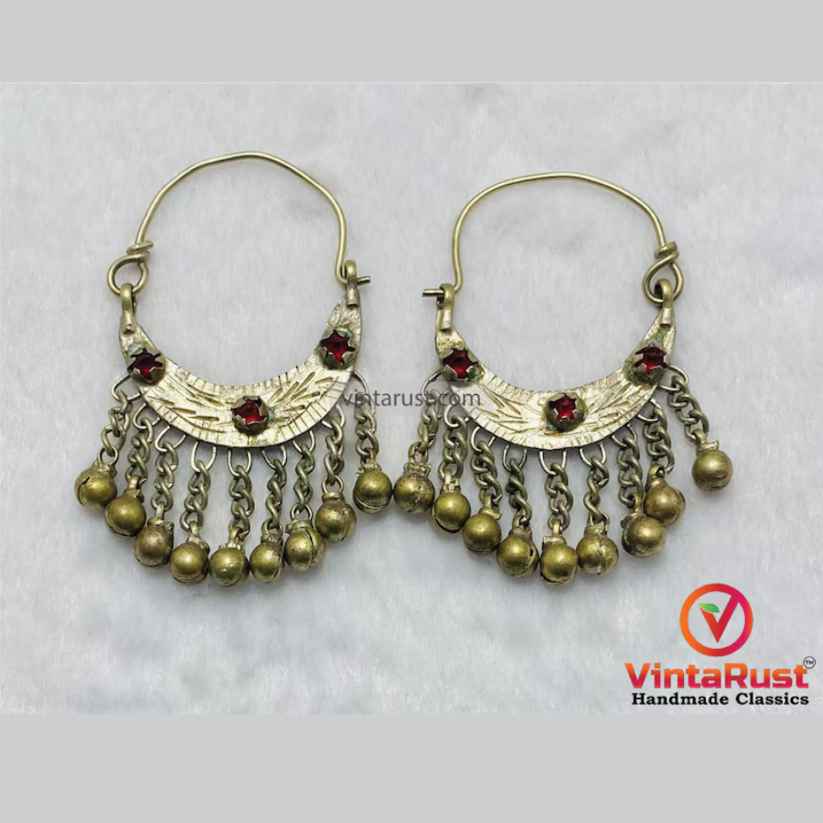 These boho tribal hoop earrings have a classic Kuchi design. They feature a textured crescent plate with small red stones. The antique gold finish gives them a handmade, vintage look. Thin chains with tiny dangling bells add soft movement and gentle sound.