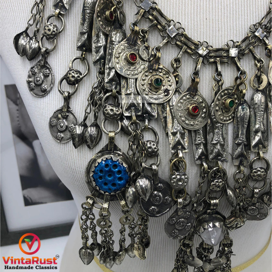 This flawless neckpiece is embellished with high-quality silver chains and hooks that are precisely tangled with each other, which offers this neckpiece an aesthetic look. The silvery fish motifs and circular dangles contain beautiful blue, green, and Red stones. The vibrant dangling tassels generate a quite melodious voice with every step. This neckpiece is particularly designed for a gorgeous soul like you and praise the hard work of tribal craftsmen by appreciating its beauty and elegance.