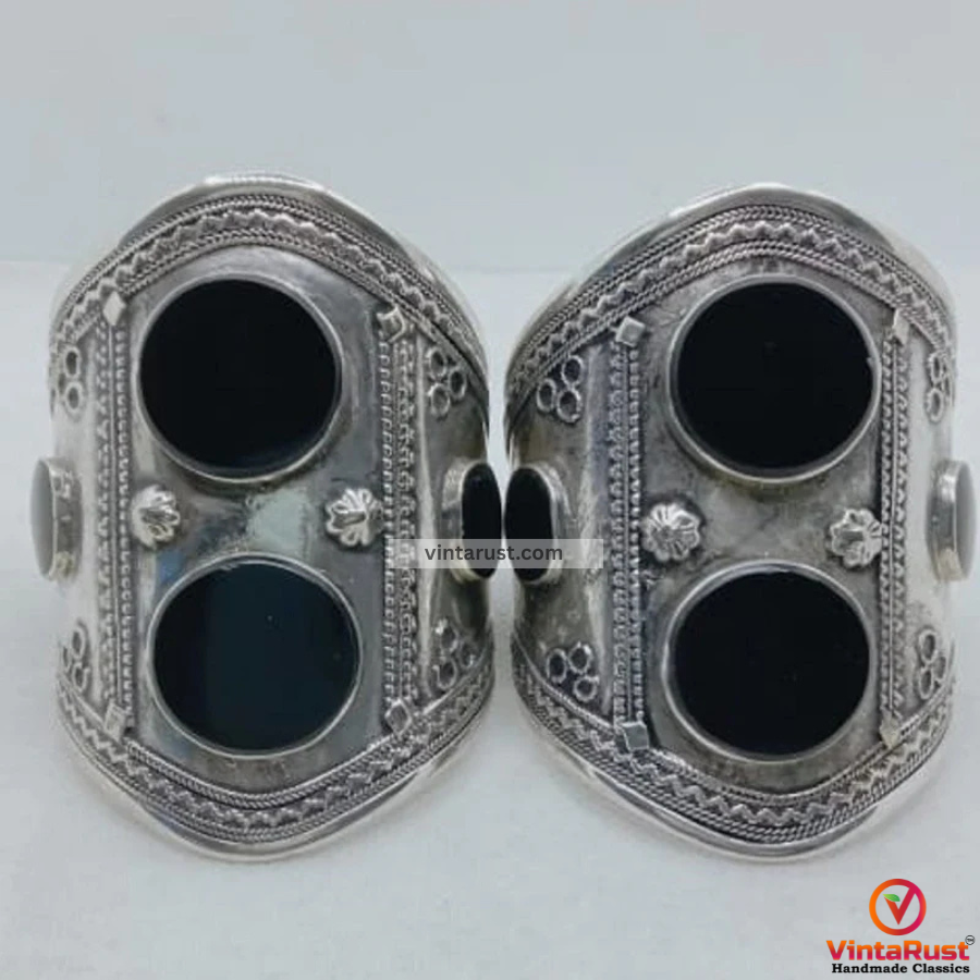 Material: These cuffs are typically crafted from metal, often silver or mixed metals, and may feature intricate engravings, filigree work, or embellishments like colorful glass or semi-precious stones.