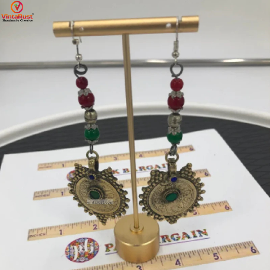 This tribal pair of elegant earrings with charming green and blue glass stones engraved in it. This tribal piece is one of the tantalizing pieces of tribal jewelry we have in our collection. These tribal earrings are such an eye catchy tribal piece which is admired by a huge number of audiences around the globe.
