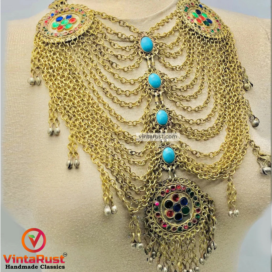 This multilayer golden bib necklace is an antique jewelry piece from our collection. This vintage-inspired multilayer tribal necklace is embellished with turquoise semi-precious stones, glass stones of multicolor and dangling rhythmic bells. The majestic tribal piece falls over the chest in a bib style and gives a royal look. The pendant of this tribal piece is of unique style.