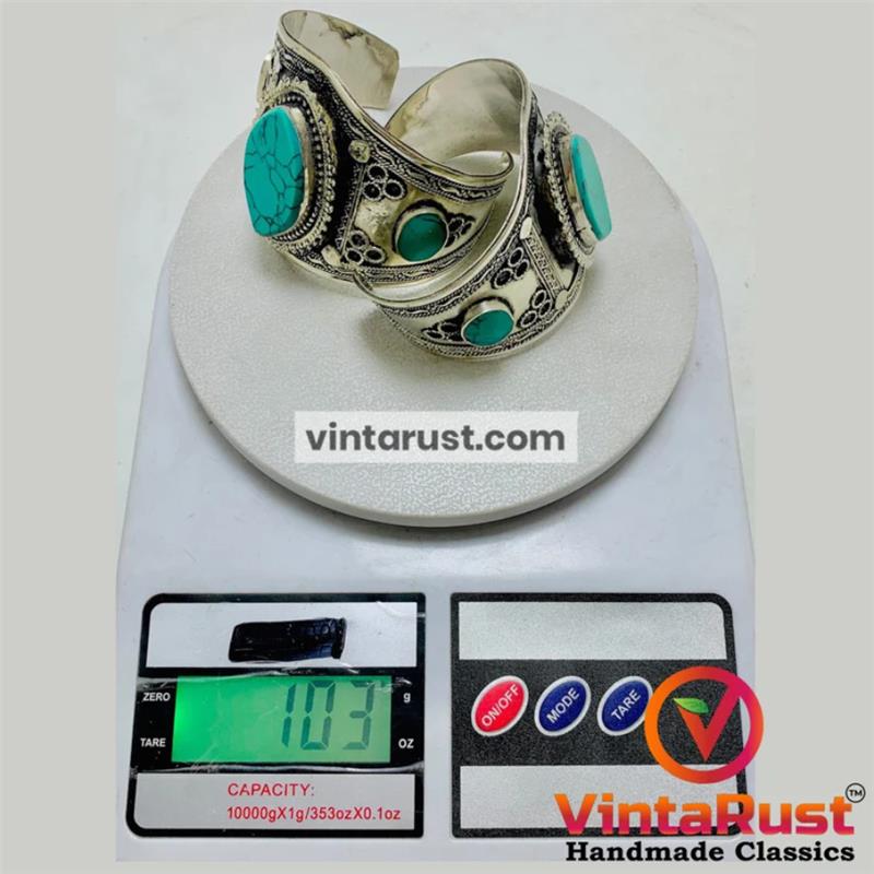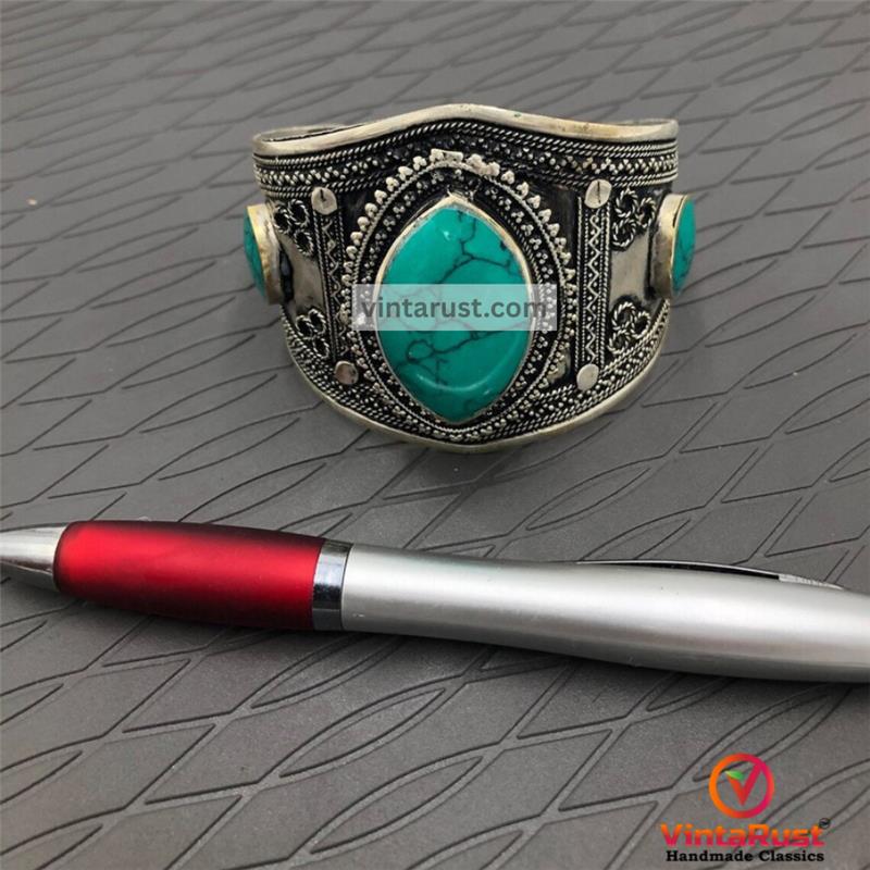 Discover the allure of tradition with this vintage semi-precious stones handcuff, a captivating fusion of heritage and style. Crafted meticulously with rusted silver-tone metal, this handcuff showcases embedded semi-precious turquoise stones and intricate archaic motifs, exuding an air of cultural richness.