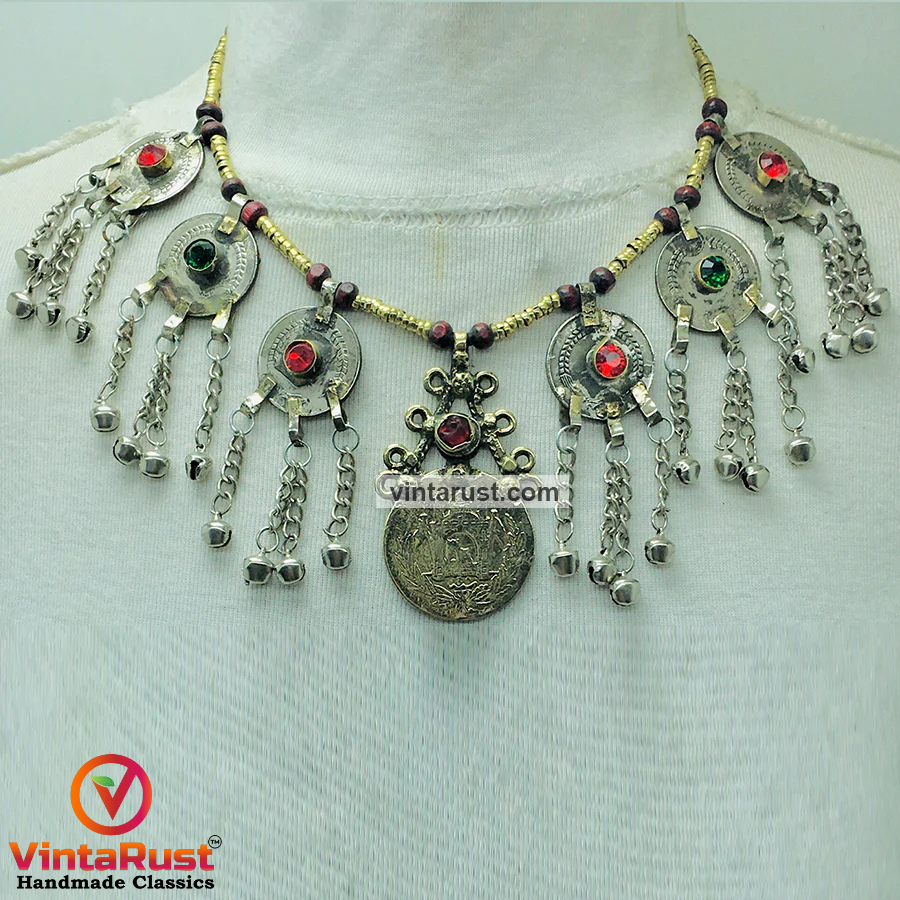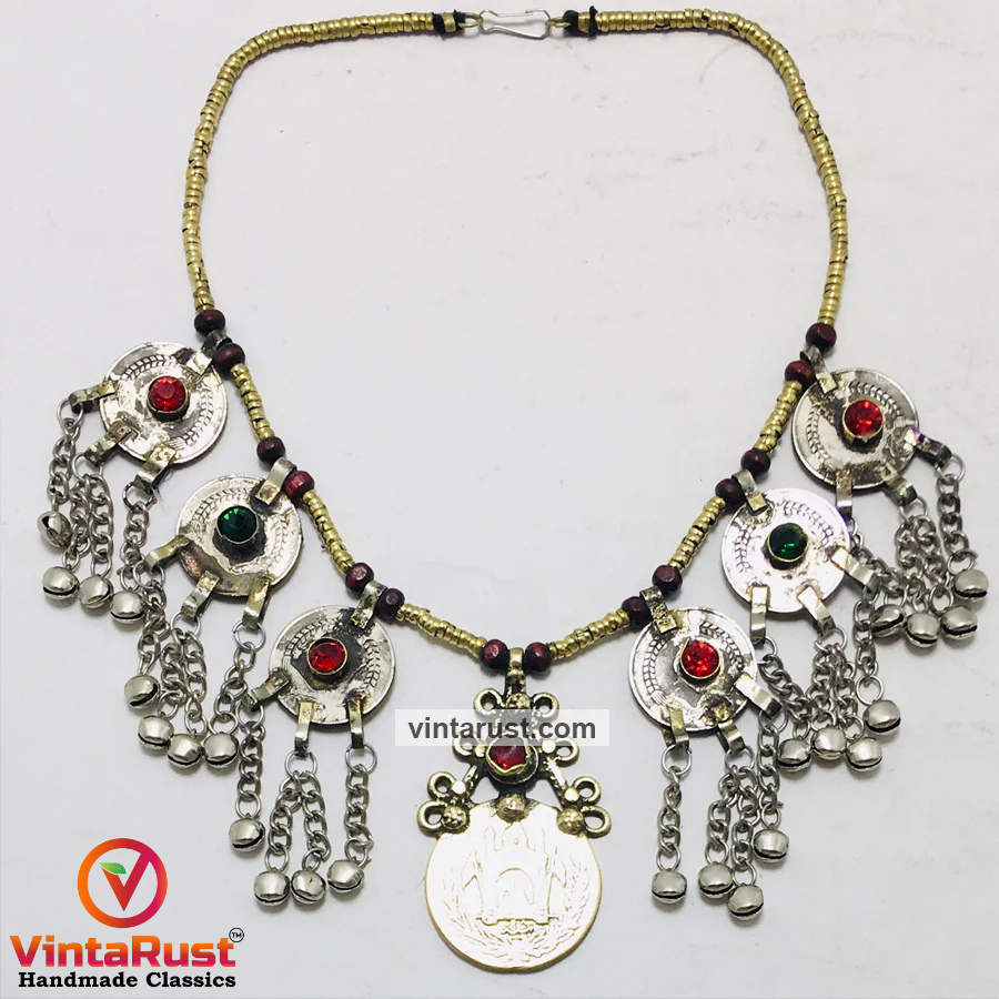 This traditionally rich Afghani tribal necklace with multihued glass stones and tribal dangling coins is one of a tantalizing piece of tribal jewelry from our collection. This necklace is a perfect addition to your jewelry collection. Glass stones of different colors are used in making this ornament an eye catchy piece. The coin pendants all over the necklace makes this ethnic jewelry piece one of the unique designs.