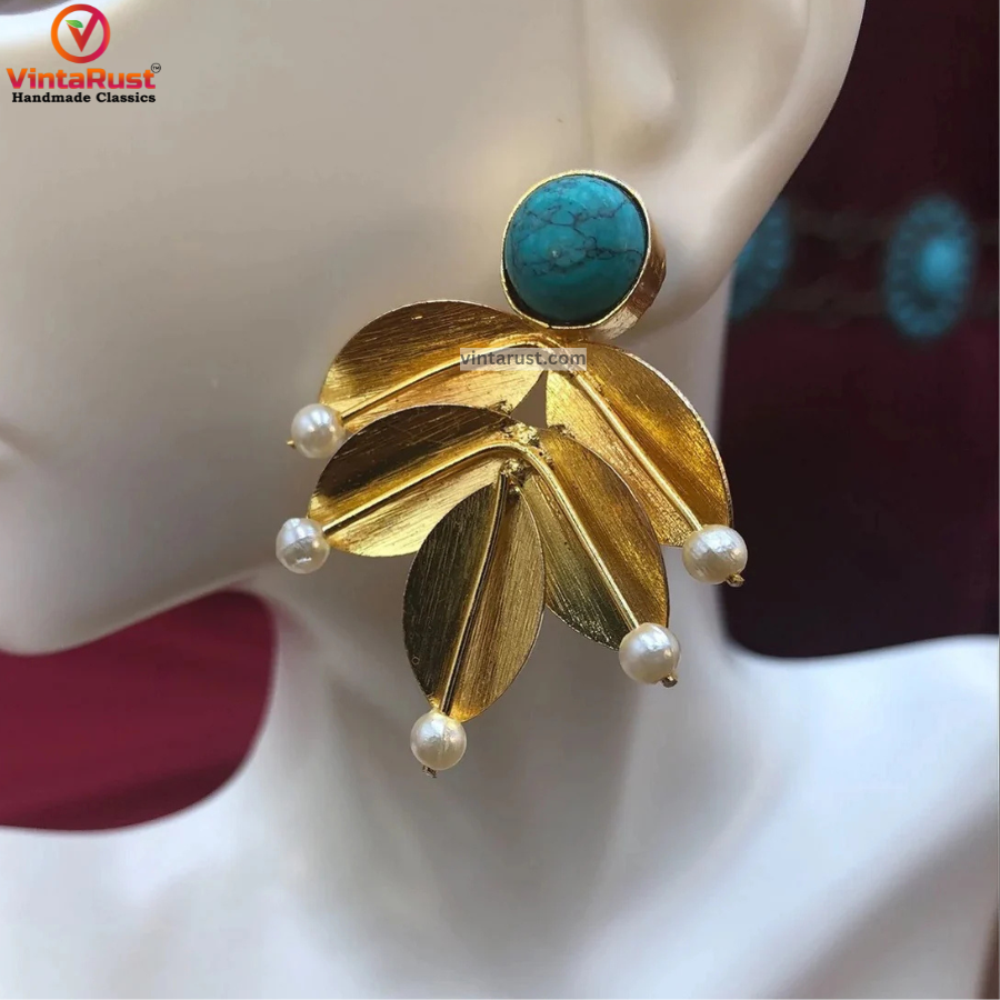 These golden floral stud earrings with turquoise semi-precious stone are a unique addition to our stunning jewelry collection. The pearl beads at the end of every petal of these earrings are making these earrings look more attractive.