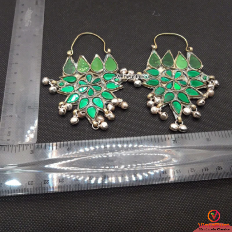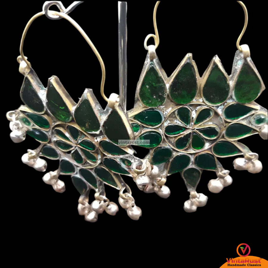 The earrings feature delicate floral designs made from green glass stones that are intricately arranged to create a beautiful and eye-catching pattern. The addition of silver bells adds a touch of whimsy and playfulness to the earrings, making them perfect for both formal and casual occasions.