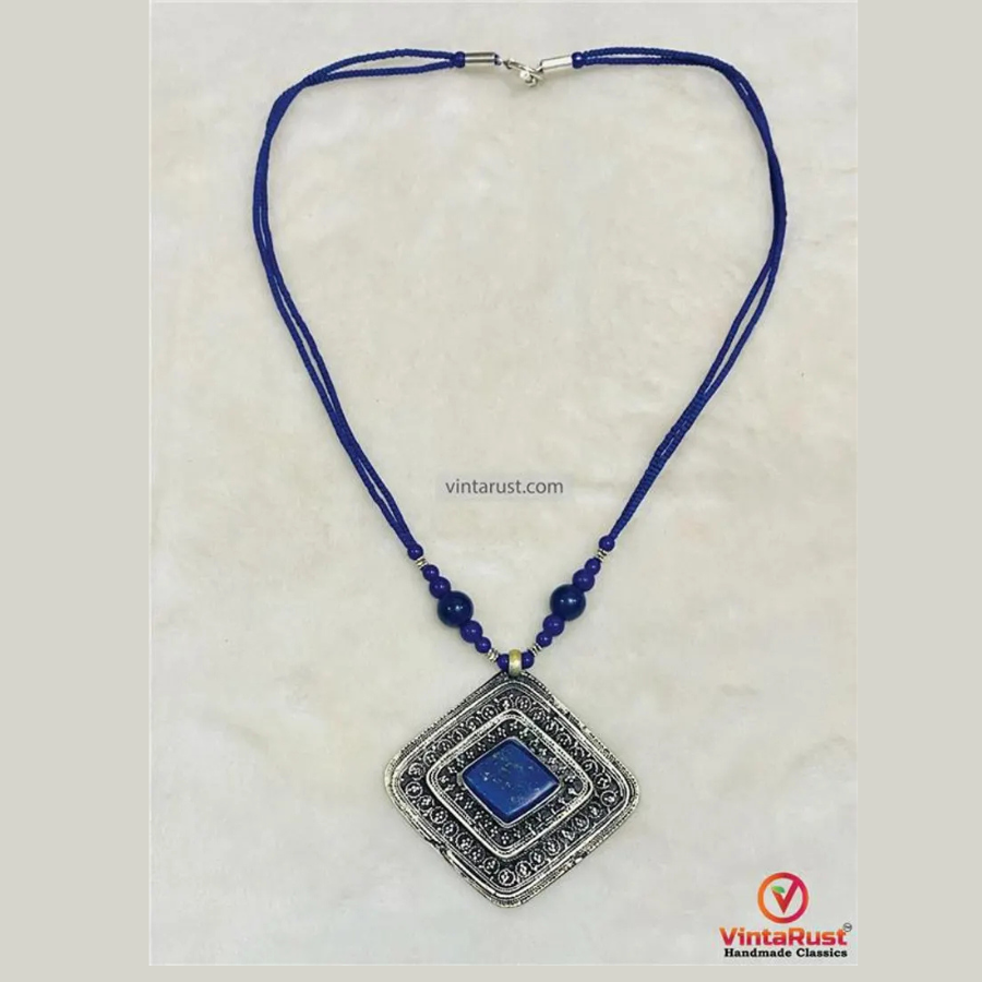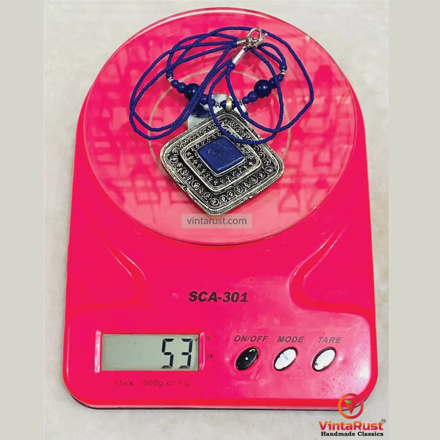The pendant is in a bohemian style with silver work around it. A square lapis stone is placed in the center which makes it more attractive. The design is traditional with a stylish touch.