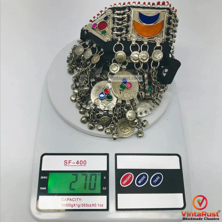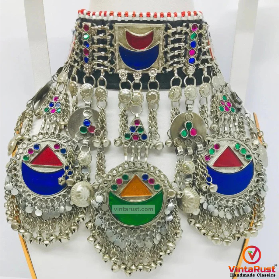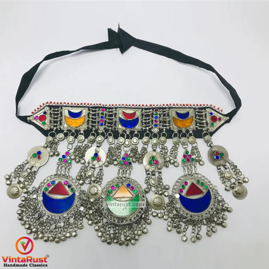 Rhythmic drooping bells give the mesmerizing feel and the sound they produce with every movement is ethereal. Tribal jewelry can make you feel unique with just a single piece. This lovely tribal choker necklace is assembled on a black cloth of fine quality. This stunning tribal piece is made by the amazing artists of South Asia.