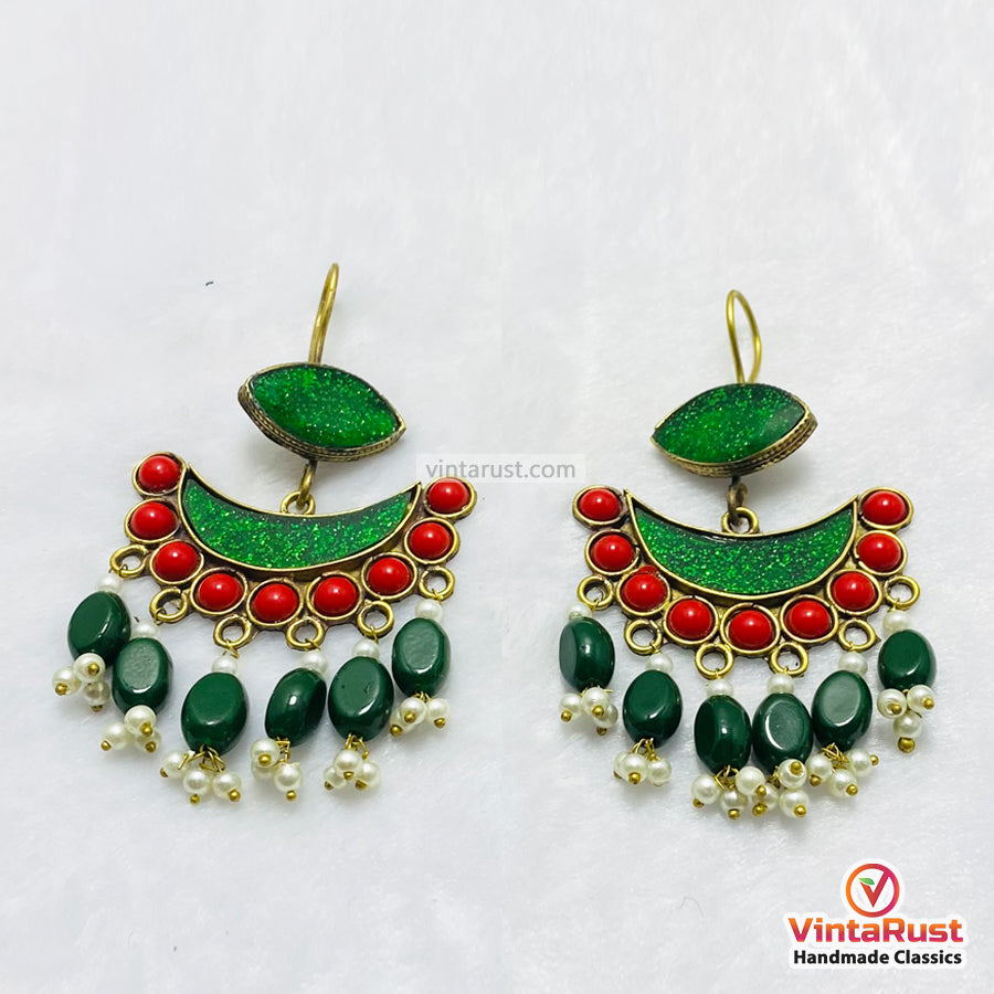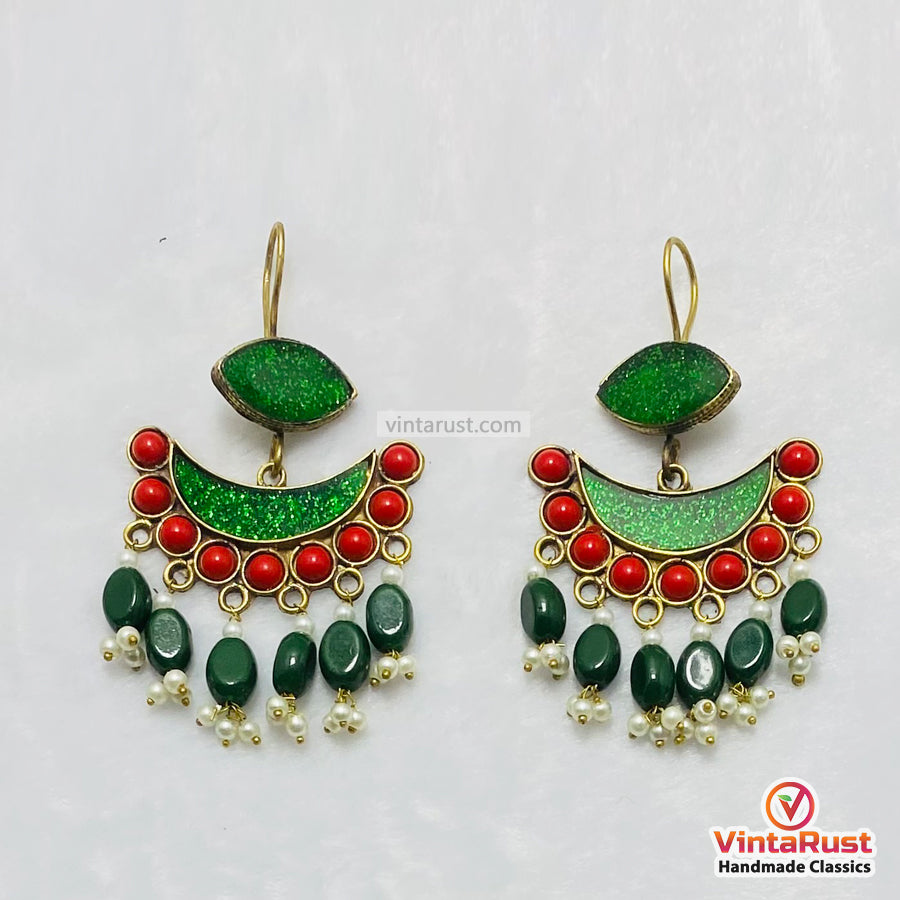 These earrings have green and red colors that look really nice together. The crescent design with small drops makes them stand out. Good choice if you like boho style jewelry.