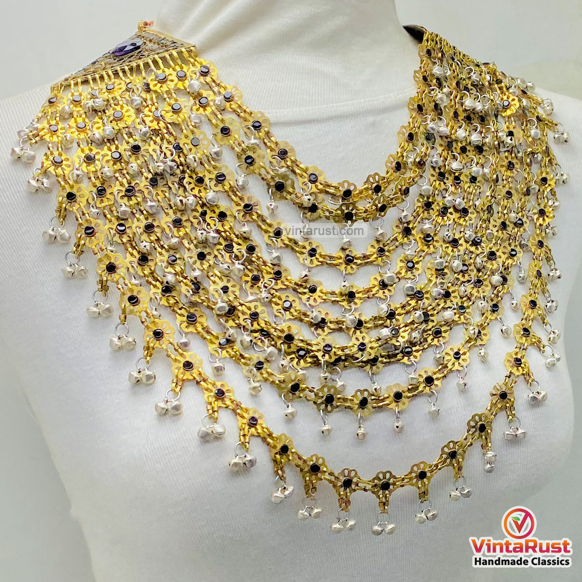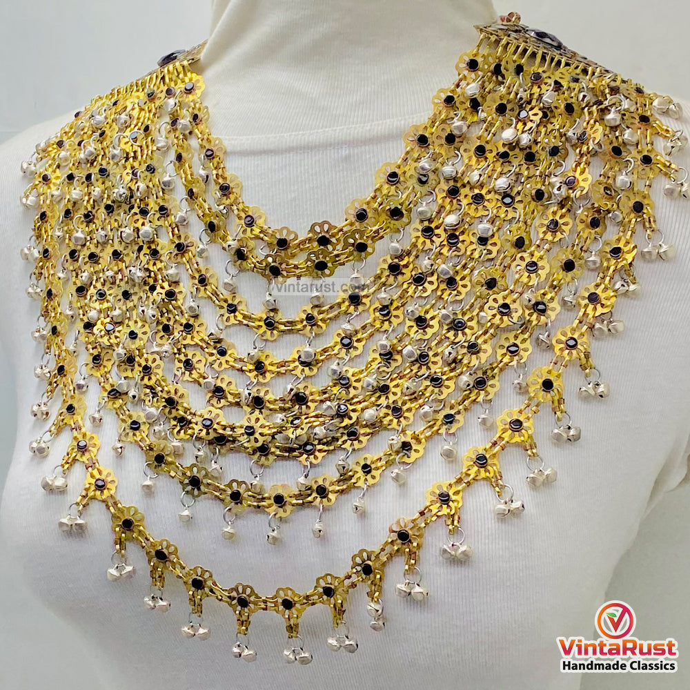 Elevate your look with this Handmade Afghan Tribal Statement Layered Necklace, a stunning piece inspired by traditional Kuchi craftsmanship. Featuring multiple cascading layers of floral metal charms and dangling bead accents, this necklace creates a bold, high-impact silhouette perfect for festivals, cultural events, weddings, and everyday boho styling. Each layer is meticulously handcrafted by skilled artisans, giving the necklace its authentic tribal character and eye-catching movement.