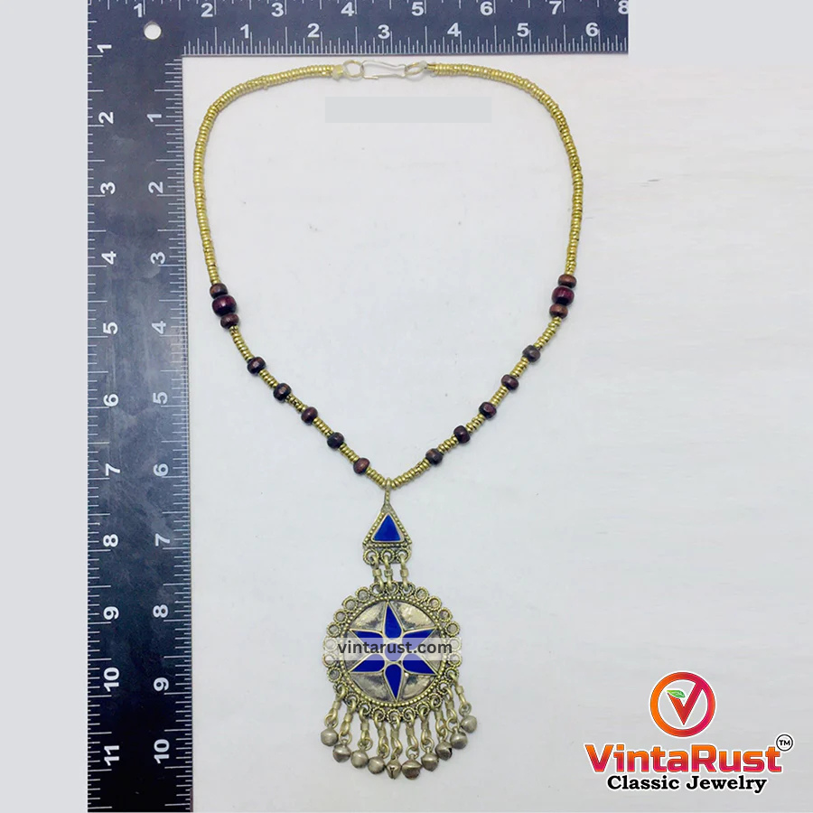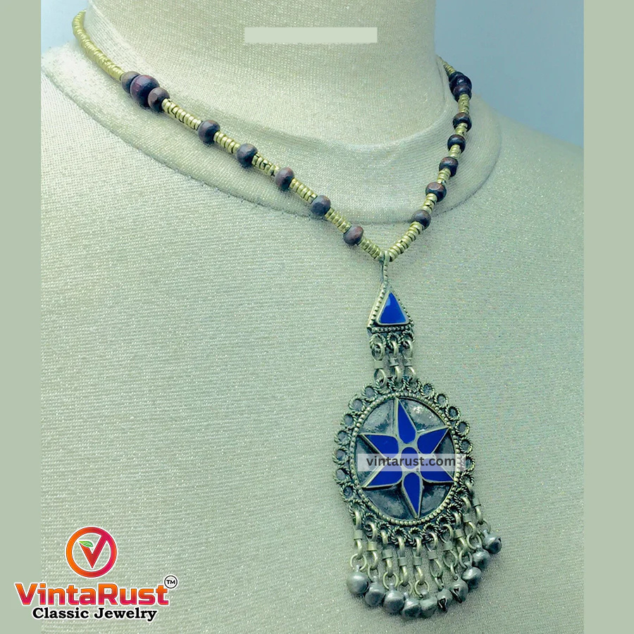 This chic lapis lazuli semi-precious stones necklace with brown rosewood beads is a statement ornament from our collection. This rustic-hued pendant necklace is handcrafted with great care and affection by South Asian craftsmen.