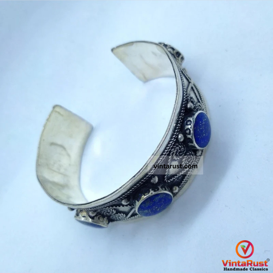 A Handmade Blue Lapis Stones Bracelet, often referred to as a Statement Boho Cuff, is a unique and stylish accessory crafted with care and attention to detail.Blue Lapis Lazuli is a striking deep-blue gemstone known for its vivid color and veined patterns of white or gold, making it a popular choice for jewelry. When incorporated into a bracelet like this, it can create a stunning and eye-catching piece.Statement Boho Cuff bracelets are typically wider than traditional bracelets, featuring a bold design that can make a statement on its own or complement other bohemian-inspired accessories. They often incorporate a mix of materials, including natural stones like Lapis Lazuli, as well as metal accents and intricate detailing.Such a bracelet can be a versatile addition to your jewelry collection, perfect for adding a touch of bohemian flair to your outfit, whether you're dressing up for a special occasion or adding a unique touch to your everyday style. It's a testament to the craftsmanship and creativity of the artisan who created it.