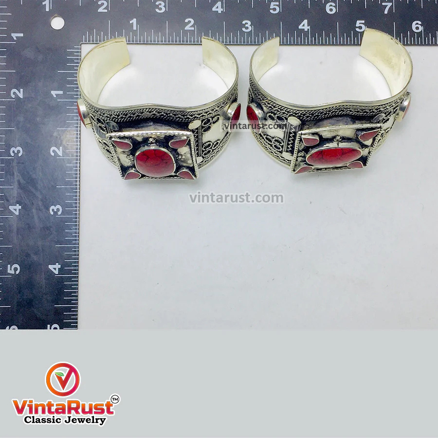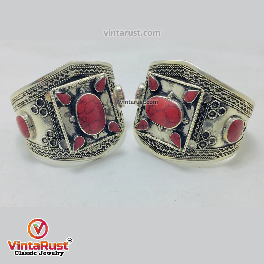 These beautiful Afghan tribal cuffs with enameled coral stones are handcrafted by our talented craftsmen of South Asia. One oval-shaped semiprecious stone is placed in the middle of the cuff and four teardrop coral semi-precious stones on each side as well as smaller stones on each end of this cuff are also placed.