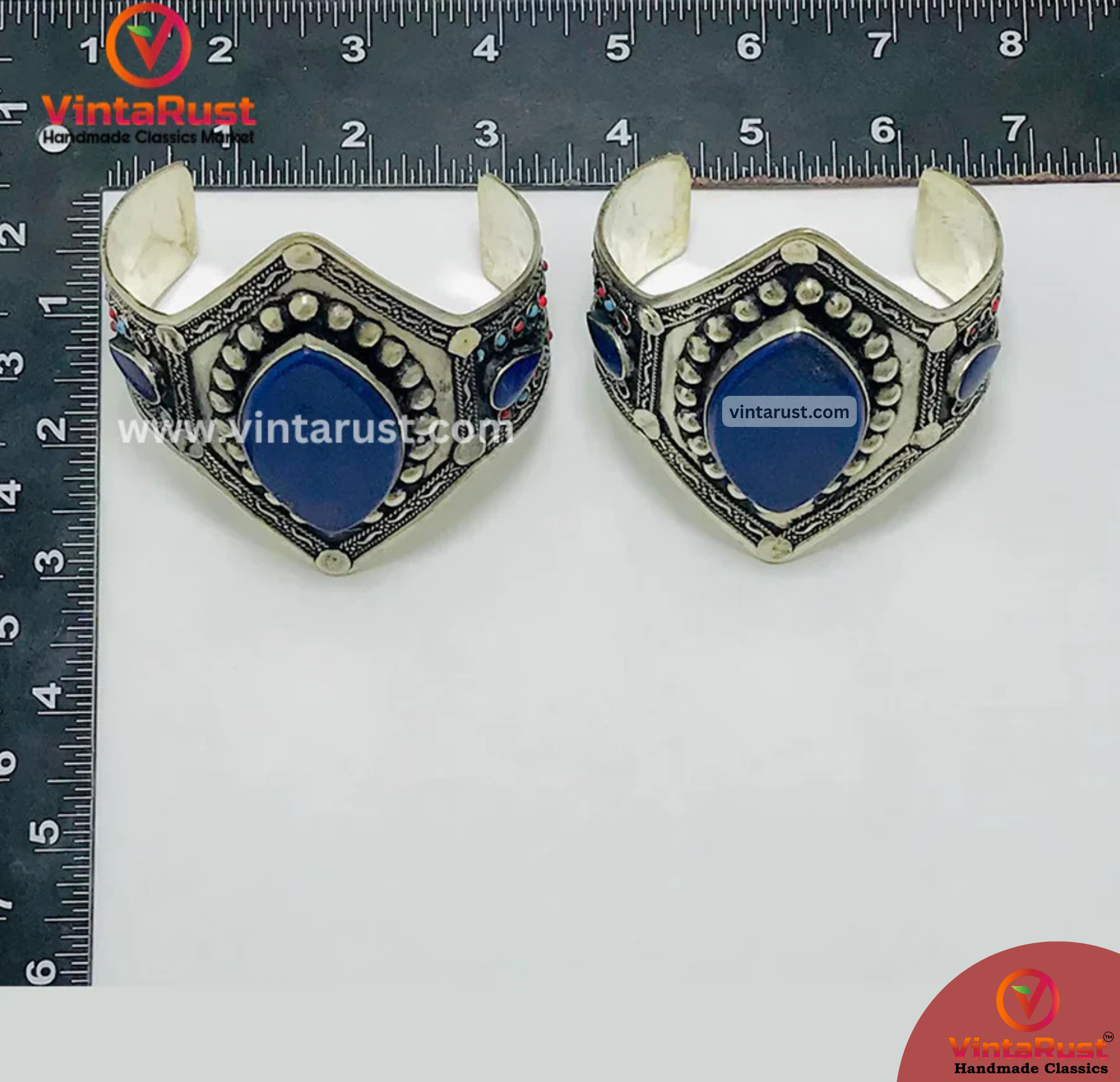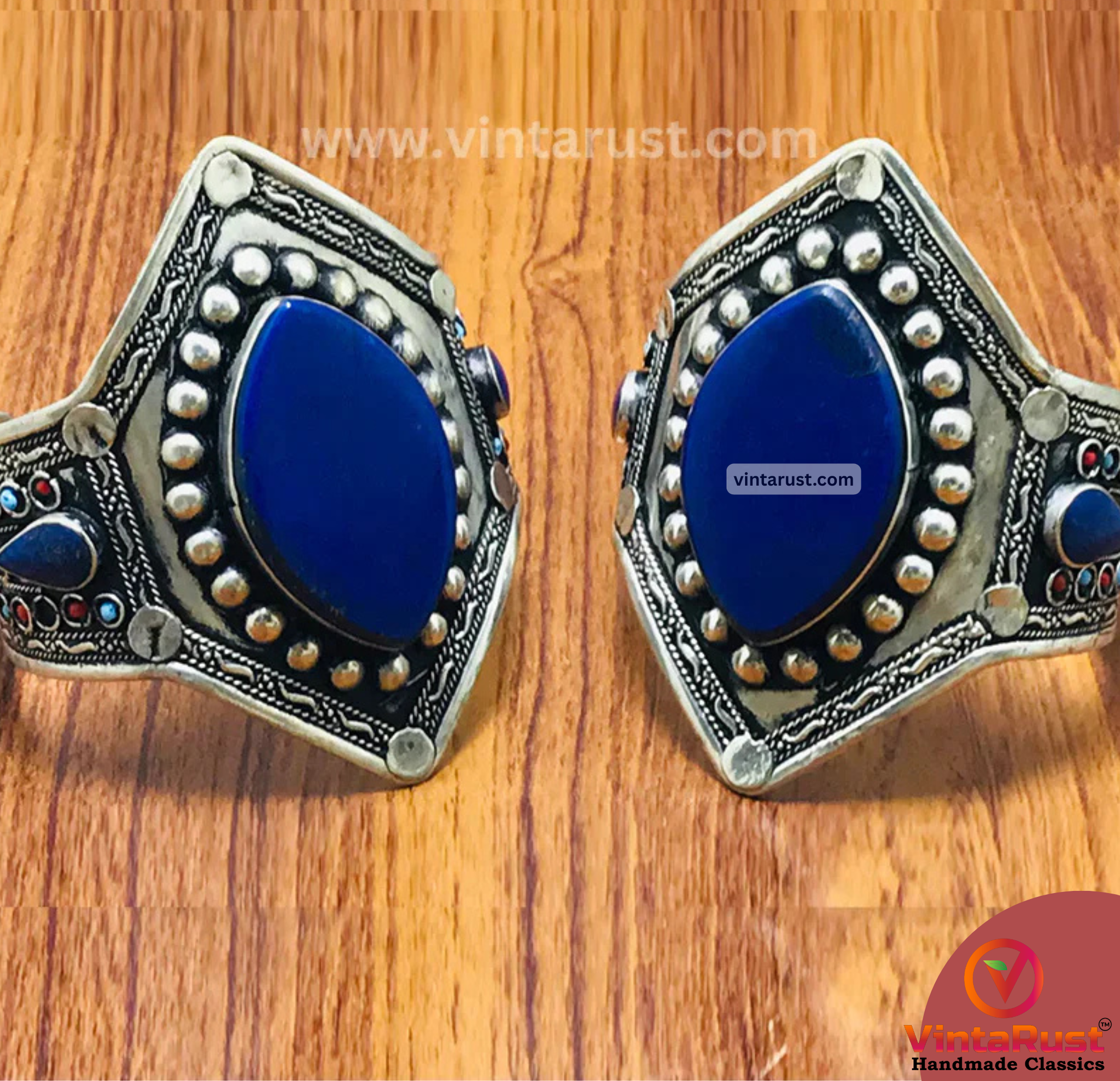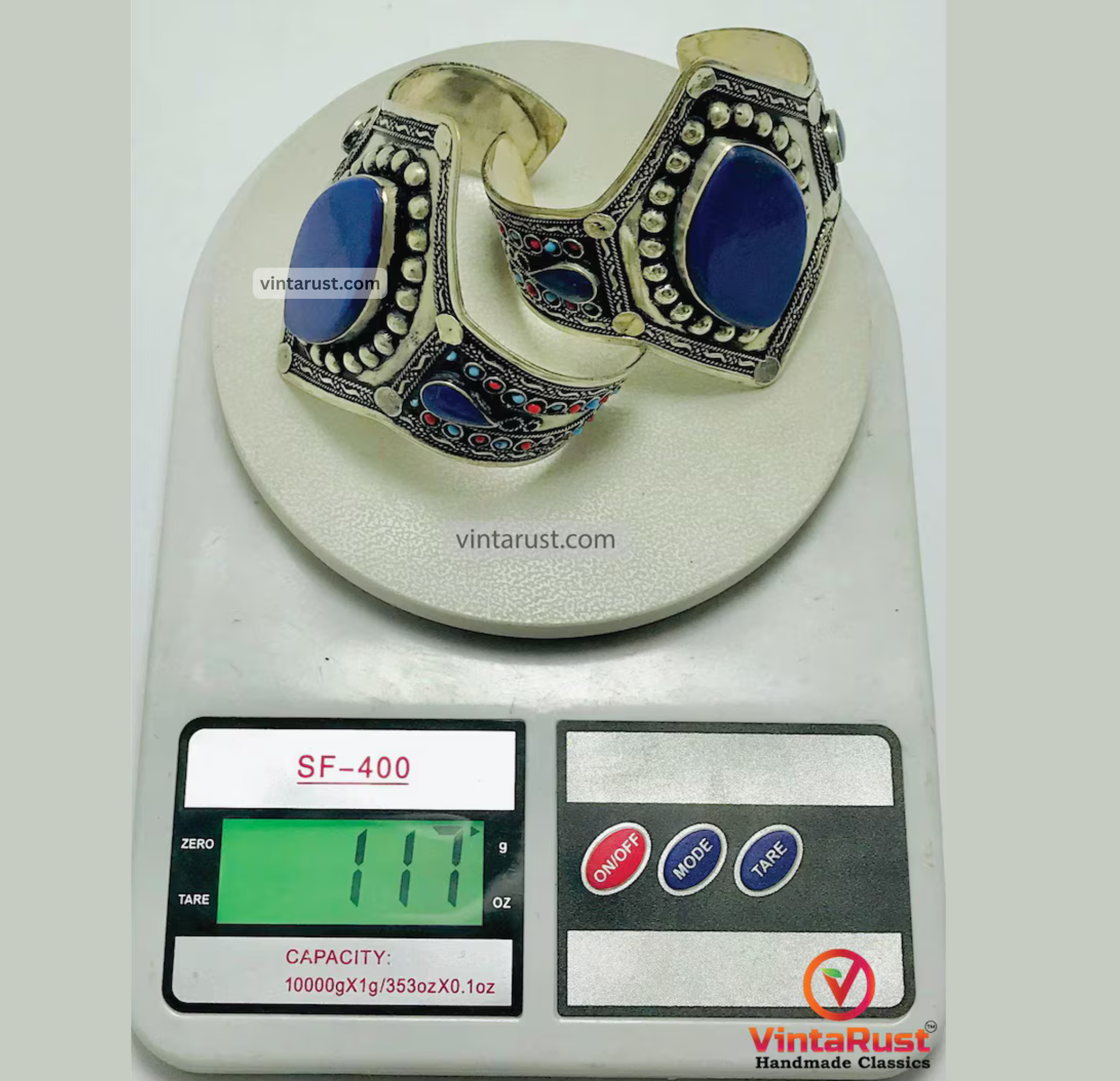 This elegant and beautiful handcrafted Afghan cuff bracelet with gorgeous enameled lapis semi-precious stones handcrafted by talented artisans of South Asia. One large oval stone centered in the middle of this rustic-hued cuff and tiny lapis lazuli stones on each side of this cuff bracelet with smaller round stones on each end of the cuff are inlaid on this handcuff.