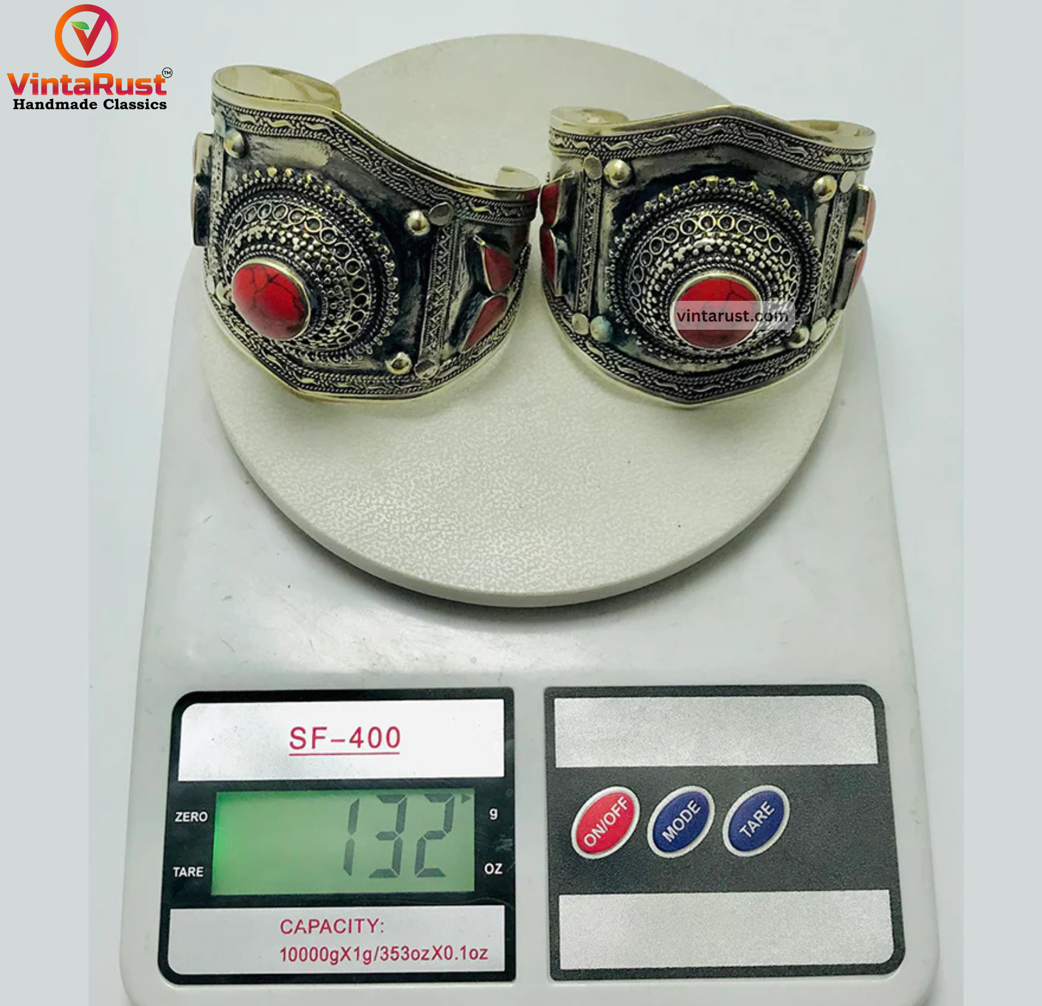 Experience the timeless beauty and craftsmanship of Afghan tribal jewelry with these mesmerizing cuffs. Each cuff features coral stones, showcasing one oval-shaped semiprecious stone at the center with hammered design.