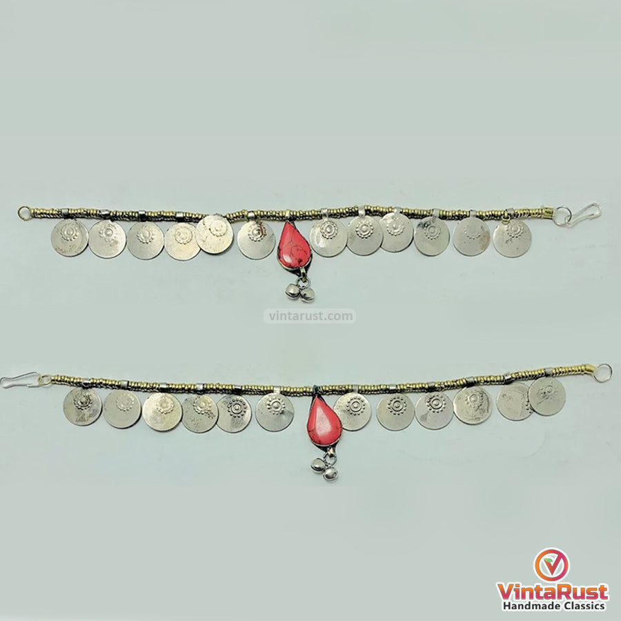 This pair of classic anklets from our collection are handcrafted by talented craftsmen of Central Asia. These ethnic tribal anklets are embellished with metallic coins and dangling silver rhythmic bells. Whenever you will wear this antique piece of art you will make a sweet and mesmerizing sound.