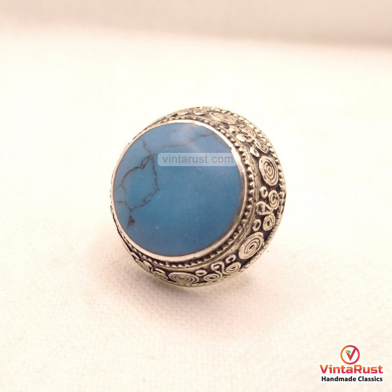 The gorgeous vintage ring is embellished with turquoise blue stone, embedded in the center. The stone is encircled with intricately carved archaic patterns. The bottom body is made with fine quality of metal alloy and covered with rustic silver hues. The light in weight yet sizable ring is good to go with any of your favorite look.