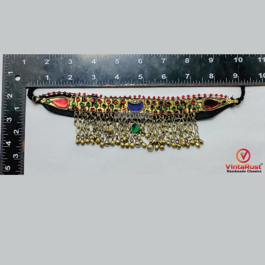 This handmade Afghan choker has a traditional tribal design with red, green, and blue glass inlays. The antique gold tone gives it a vintage look, and the dangling bells make a soft, pleasant sound when you move. It is perfect for boho or ethnic outfits for any occasion.